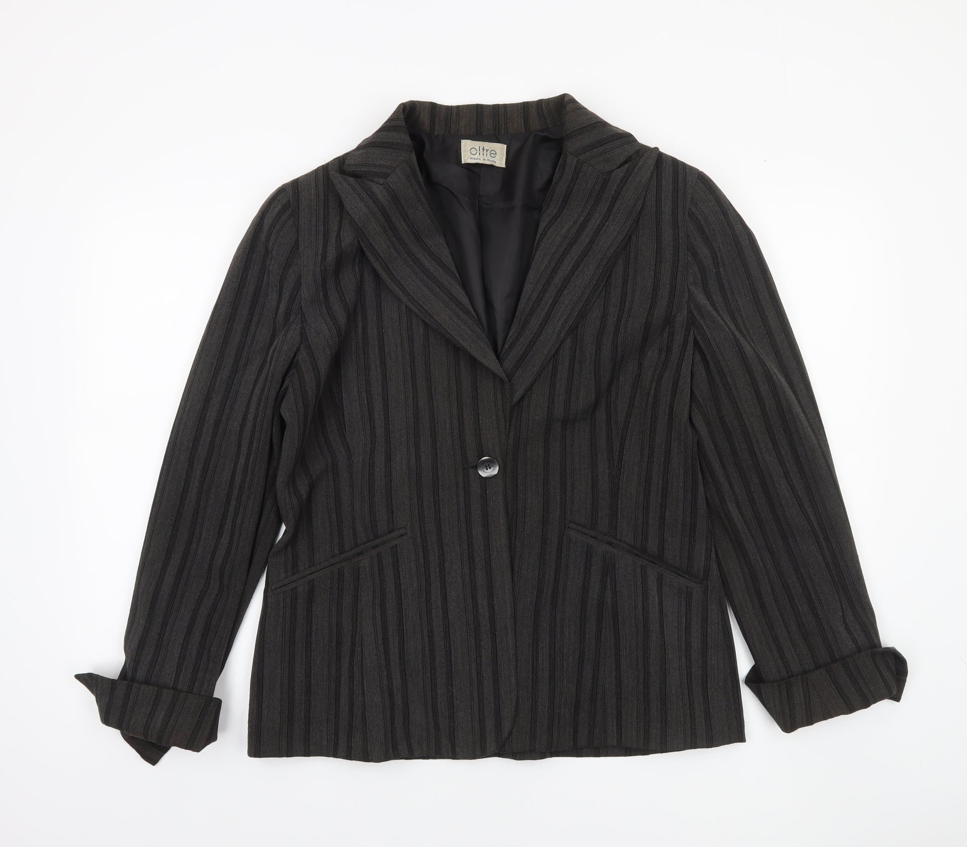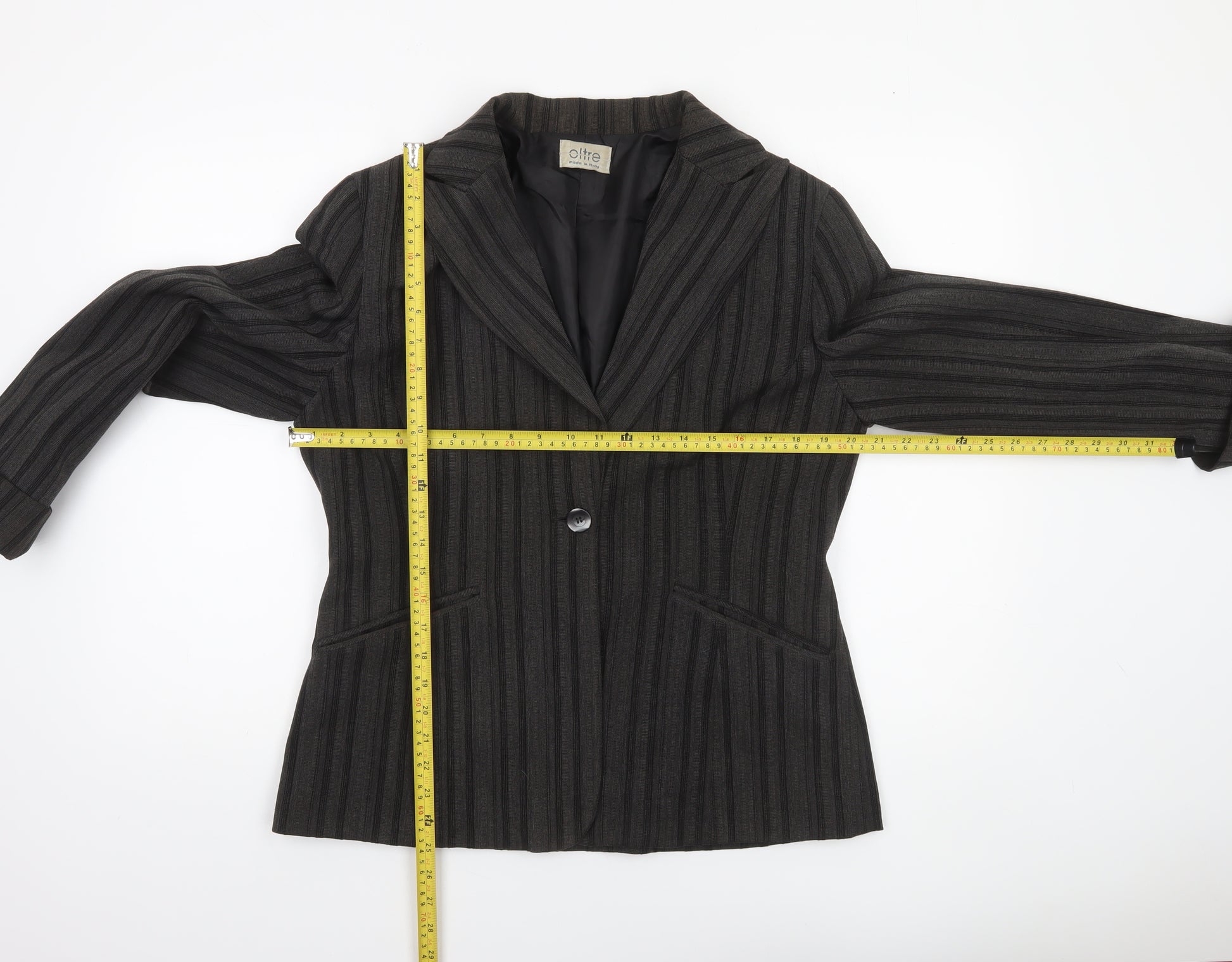 Elegant and sophisticated, this Oltre women’s blazer in size 16 exudes timeless Italian craftsmanship. Made in Italy, the blazer reflects the brand’s commitment to high-quality tailoring and a refined aesthetic. The jacket features a subtle brown and black pinstripe pattern, delivering a smart, professional appearance suitable for both office settings and formal occasions. Cut in a flattering single-breasted design with a single front button, it creates a streamlined and classic silhouette while ensuring comfort and wearability. The notched lapels add a traditional touch that complements its structured tailoring.Crafted from a luxurious blend of polyester, viscose, and elastane, the blazer offers both breathability and stretch, allowing ease of movement throughout the day. The fully lined interior, composed of soft polyester, ensures a comfortable fit and lasting durability. The material composition blends 64% polyester, 34% viscose, and 2% elastane, providing just the right amount of flexibility while maintaining a polished form. Two front welt pockets finish the look with functional elegance.The regular length and long sleeves make this piece versatile across multiple seasons—perfect for autumn layering, winter business wear, or springtime styling. It pairs effortlessly with tailored trousers or skirts for professional meetings and can also be styled casually with jeans for a sharp yet relaxed ensemble. The blazer’s smooth inner lining and notch lapels create a tailored, structured look ideal for anyone seeking sophistication and practicality in one timeless wardrobe piece. With slight signs of previous wear but no visible flaws, the condition remains excellent.Whether you’re dressing for work, an interview, or a formal event, this Oltre pinstripe blazer offers a combination of Italian elegance and modern wearability that makes it a smart and valuable addition to your wardrobe.
