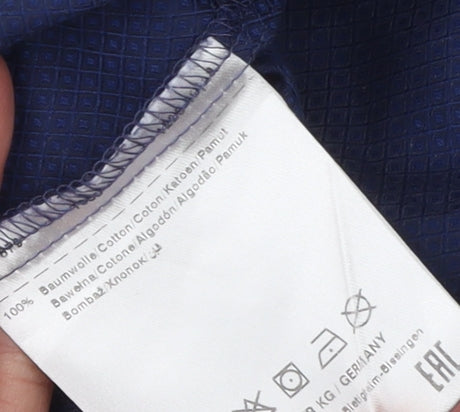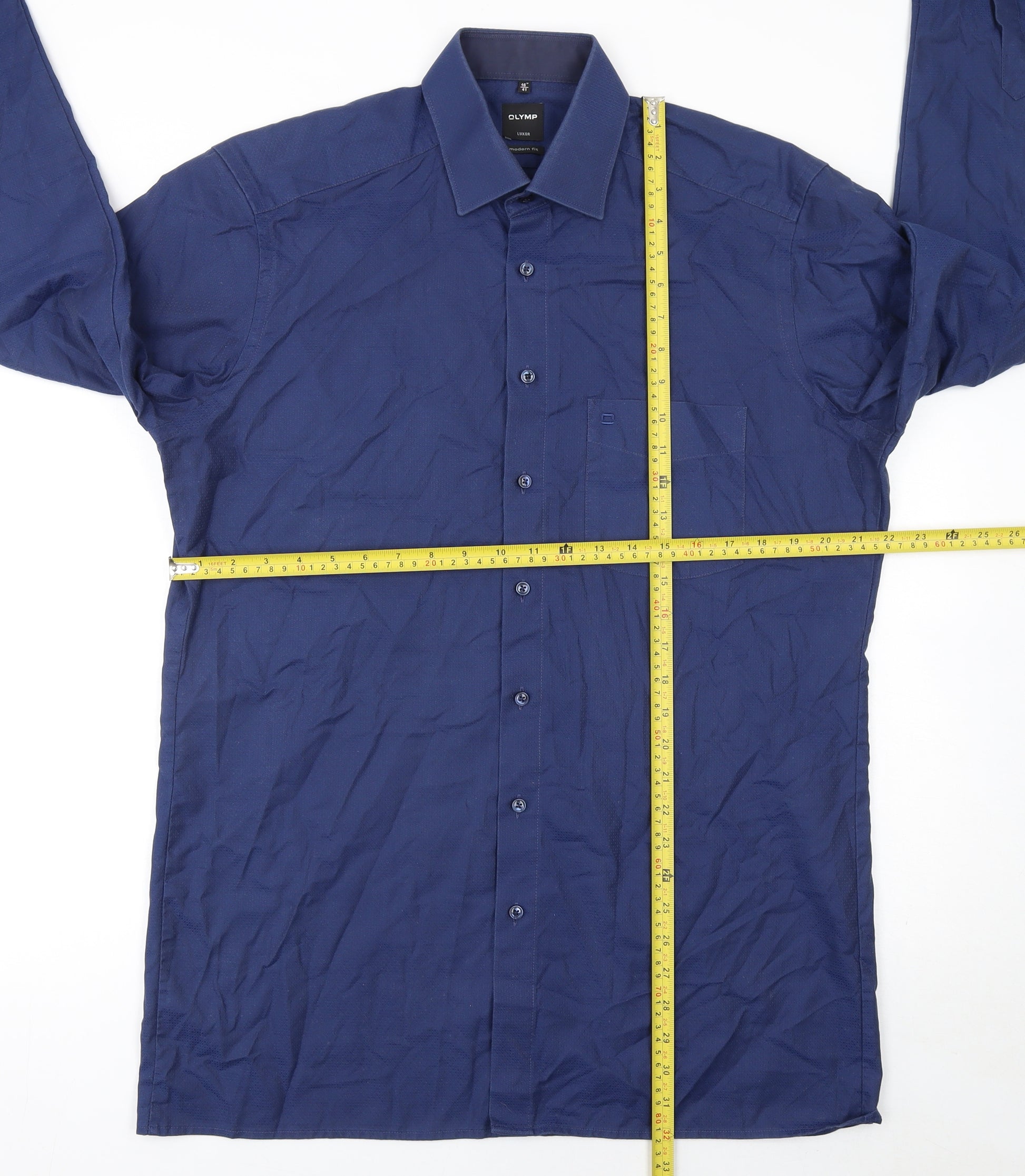 Elevate your wardrobe with this sophisticated OLYMP Luxor men’s formal shirt, designed with precision in mind for the modern gentleman. Crafted from 100% cotton, it offers a breathable and non-iron finish, making it a practical yet luxurious choice for both day-to-day business wear and formal occasions. The shirt’s deep blue tone gives it a timeless appeal, complementing a wide range of suits and ties for effortless style. This long sleeve dress shirt features a regular fit known by OLYMP as ‘Modern Fit’, providing a flattering silhouette with comfort and ease of movement. The point collar ensures a sharp and classic look, while the neatly stitched barrel cuffs and button through front emphasize its formal character. A chest pocket adorned with the discreet OLYMP logo elevates its professional aesthetic. Made to the highest standards, OLYMP’s Luxor line is celebrated for its easy-care properties, allowing you to maintain a crisp, freshly pressed appearance with minimal effort. The woven geometric texture adds subtle visual depth, giving the shirt character without overpowering its refined style. Perfect for business meetings, office wear, weddings, or evening events, this shirt combines functionality with elegant sophistication. Pair it effortlessly with tailored trousers and leather accessories for formal styling or dress it down with chinos for a more relaxed approach. With a 16-inch (41 cm) neck size, chest measurement of approximately 55 cm, and length of 80 cm, it provides an ideal balance between comfort and smart tailoring. In excellent pre-loved condition with only light creasing from storage and no visible wear or flaws, this shirt delivers premium quality and lasting value from a trusted European brand. The OLYMP Luxor Modern Fit shirt is an essential addition to any wardrobe, representing the best of modern shirting with luxurious materials and timeless design.