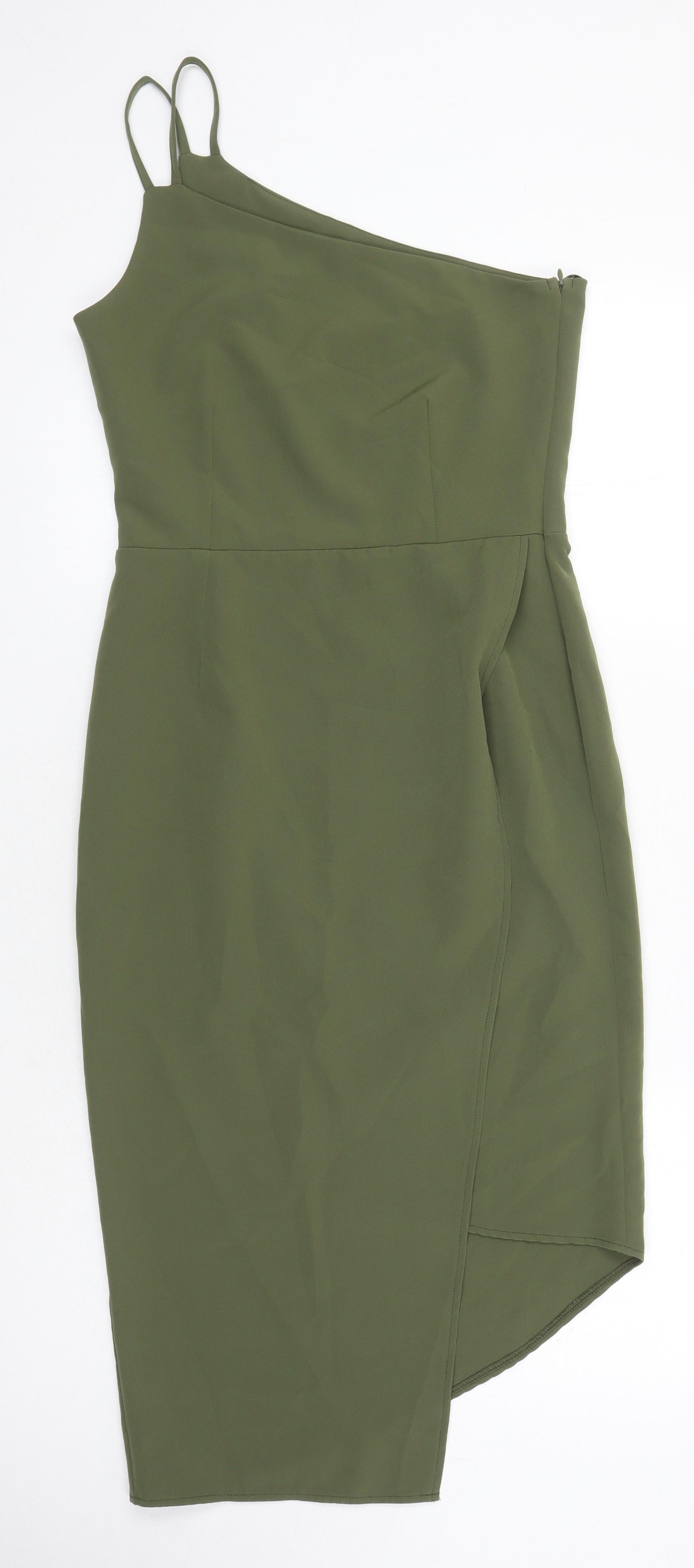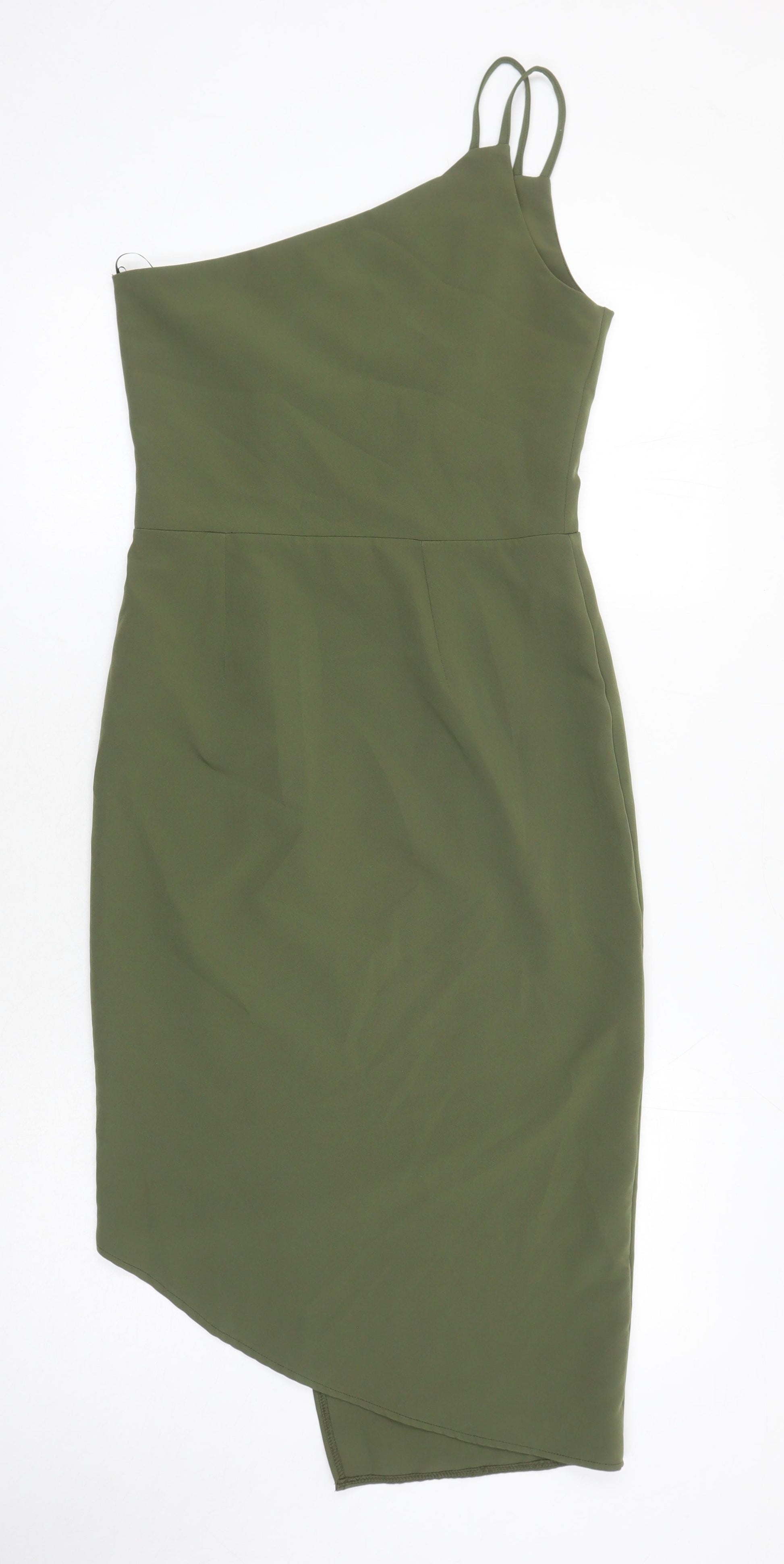 Womens Green Houndstooth Polyester Pencil Dress Size S One Shoulder Zip