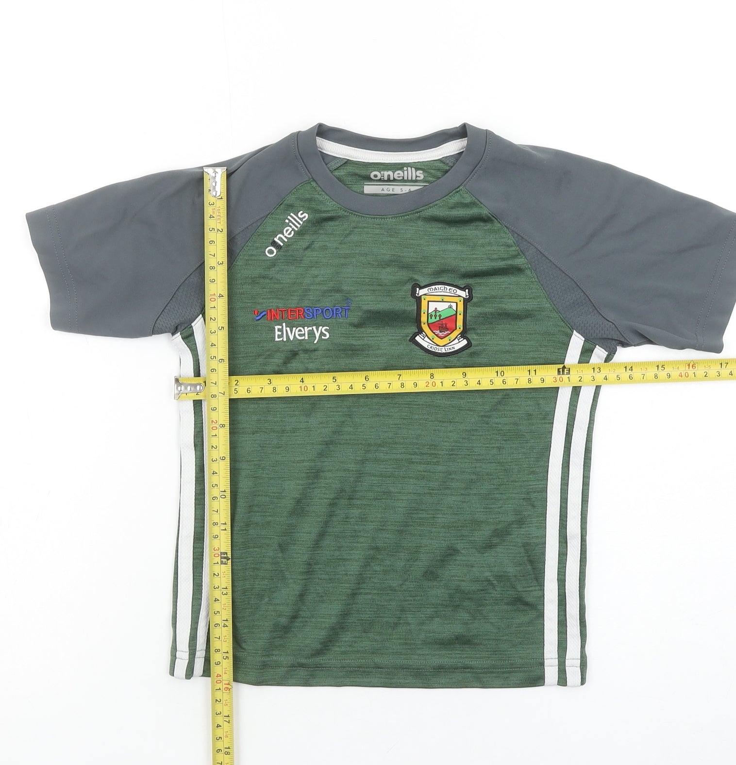 Get your young sports enthusiast ready for action with this O'Neills Boys Green Short Sleeve Sports T-Shirt in size 5-6 Years. Designed for comfort and performance, this athletic tee is perfect for football, rugby, training, or everyday wear. The shirt features a breathable and moisture-wicking polyester construction, ensuring your little one stays cool and dry, whether on the pitch or at play. Built in high-performance fabric, the T-shirt has a regular fit and is soft against the skin, offering freedom of movement for any activity. Styled in a striking dark green with grey raglan short sleeves and white stripe detailing, this O'Neills top captures a sporty yet stylish look. The chest showcases the Mayo GAA crest and branded sponsor logos, paired with O'Neills’ iconic logo for authentic sportswear appeal. The crew neckline provides easy pull-on wear, while the lightweight, quick-dry material is perfect for active days out. Durable, machine washable, and crafted from quality polyester with a touch of elastane for stretch, it’s built to withstand frequent washing and everyday use. Ideal for both team support and training sessions, this shirt delivers reliability, comfort, and effortless athletic style. Whether worn for matches, sports club training, or outdoor play, it’s a versatile top that looks as good as it performs. With O'Neills’ signature quality and dependable fit, this kids’ sports tee is a great addition to any active boy’s wardrobe. An excellent value find for parents seeking durable, trusted sportswear suitable for multiple activities and casual wear alike.