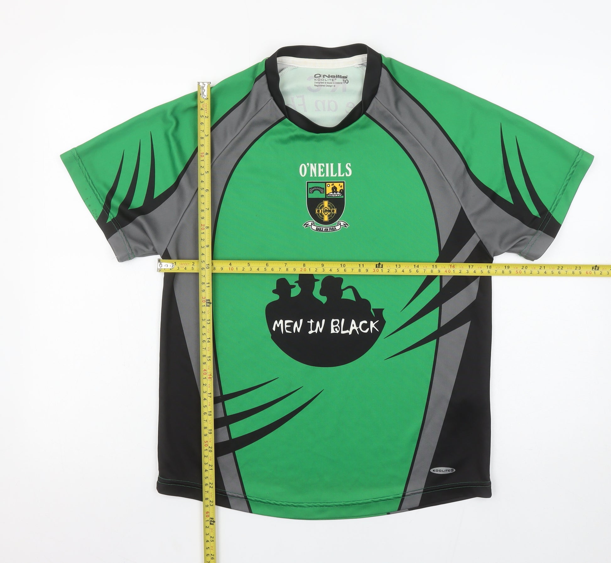 This O’Neills women’s green sports jersey T-shirt in size 10 is the perfect blend of performance, comfort, and style. Designed and made in Ireland, it’s crafted from 100% polyester material, offering excellent breathability and lightweight wear, ideal for active use or casual days out. The KOOLITE fabric technology helps draw moisture away from the body, keeping you cool and comfortable even during the most intense activities. Featuring a striking green tone with contrasting grey and black panels, this jersey exudes sporty confidence, while the raglan short sleeves allow for greater freedom of movement. The bold front design with the 'Men In Black' motif and crest detail adds a unique touch, making this shirt stand out both on and off the field. Its classic crew neckline enhances comfort and provides a neat, timeless finish. Suitable for warm weather, this sporty O’Neills jersey embodies functionality and modern athletic style, whether you’re training, spectating, or just adding a casual edge to your wardrobe. In excellent pre-owned condition, this garment has been carefully checked to ensure durability and quality, with no marks, tears, or faults noted. Perfect for wearing with leggings, tracksuit bottoms, or casual jeans, it’s an easy-to-style piece for any wearer who appreciates reliable performance wear with a dash of individuality. Machine washable for convenience, this T-shirt is ideal for those who value practicality without compromising on a flattering fit. From the gym to casual outdoor events, this versatile top represents Irish sportswear craftsmanship at its best. Secure this stylish green O’Neills sports jersey today and enjoy durable fabric and athletic flair season after season.
