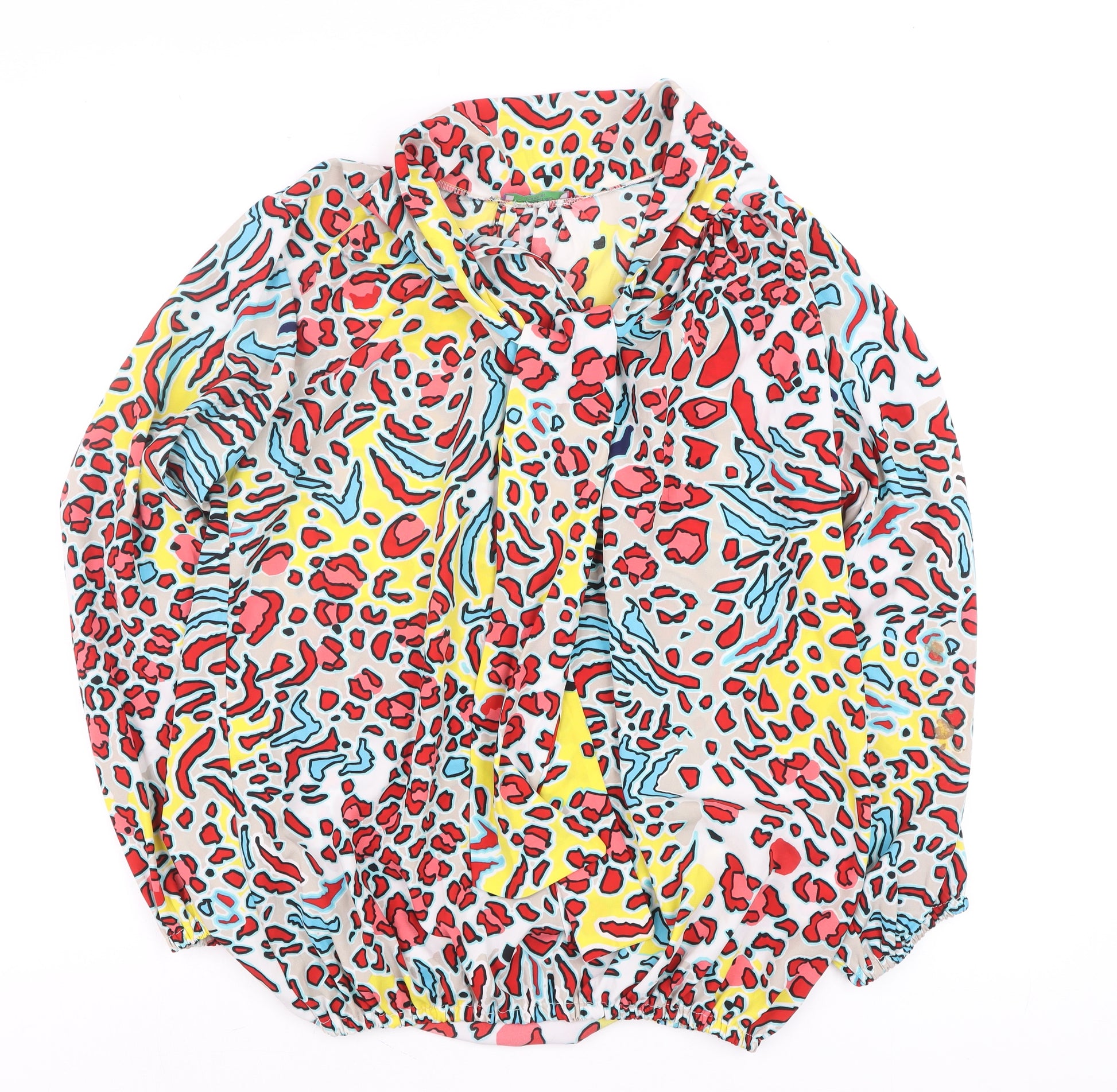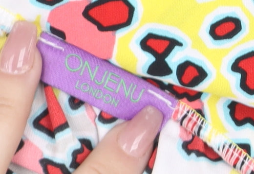 Add a burst of vibrant style to your wardrobe with this stunning women’s blouse from Onjenu London. Designed in a lively multicoloured abstract animal print of red, yellow, blue and ivory tones, this blouse delivers a statement look that’s perfect for casual days or upbeat evenings alike. Crafted from 100% polyester, the lightweight chiffon-style fabric offers breathability and comfort while maintaining an elegantly soft drape. The blouse features a collared neckline, full-length sleeves with elasticated cuffs, and a loose tunic-style fit that flatters the silhouette without feeling restrictive. The button-up front adds ease of wear, while the gathered hem subtly shapes the waist for a refined finish. Its vibrant pattern and relaxed cut make it versatile enough to pair with tailored trousers for work or with jeans for a modern, laid-back look. Machine washable for fuss-free care, this blouse is practical as well as stylish. Ideal for spring and summer, it embodies Onjenu London’s signature flair for bold prints and feminine cuts. In excellent pre-owned condition with very minimal signs of wear, it provides great quality and colour vibrancy for seasons to come. Perfect for women who love contemporary yet easy-to-wear fashion, this Onjenu blouse will add instant personality to your wardrobe and elevate even the simplest outfit. A wonderful find for those who appreciate colourful prints, flattering fits, and polished everyday elegance.