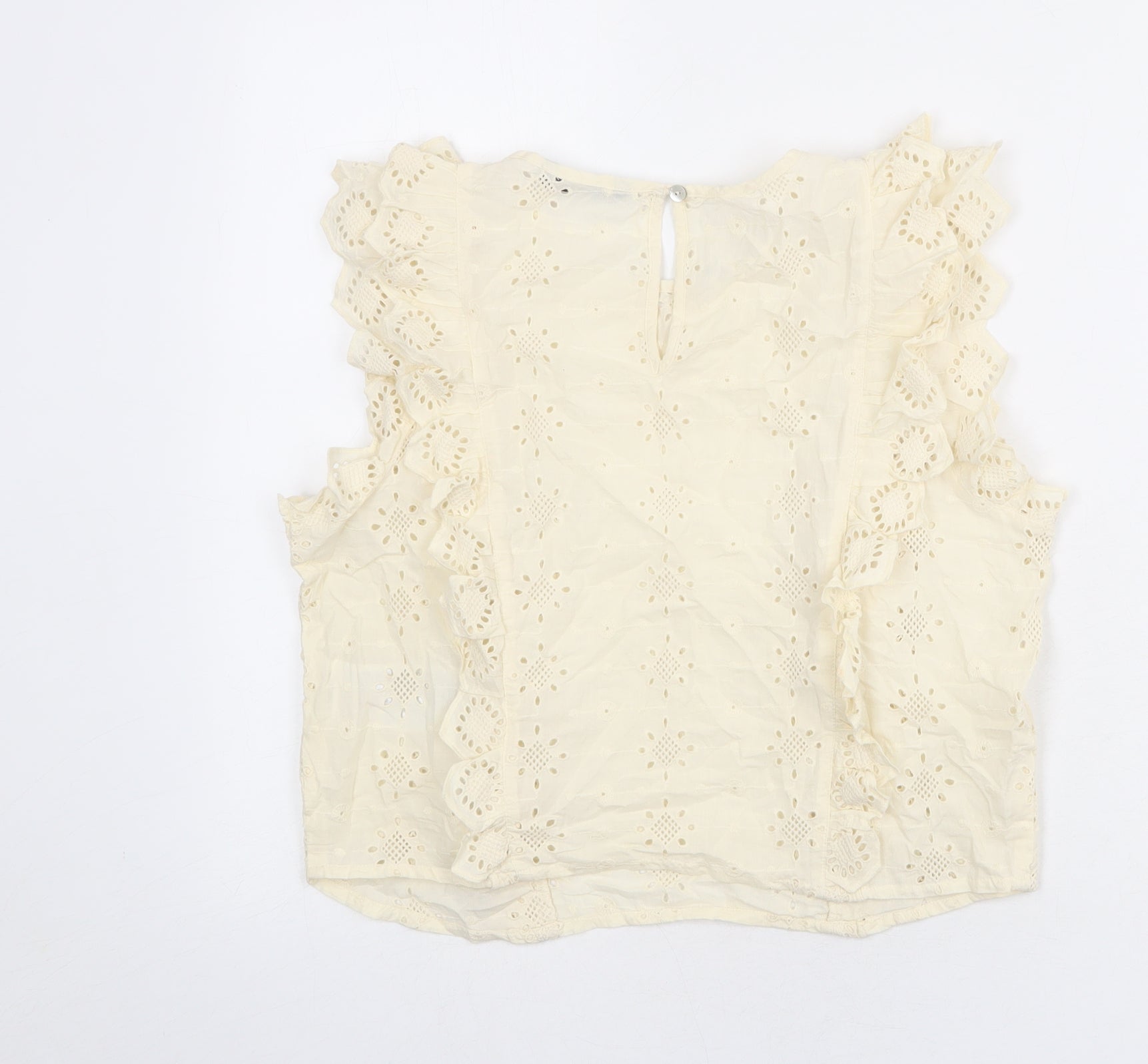 Womens Yellow 100% Cotton Basic Blouse Size 8 Crew Neck - Broderie Anglaise