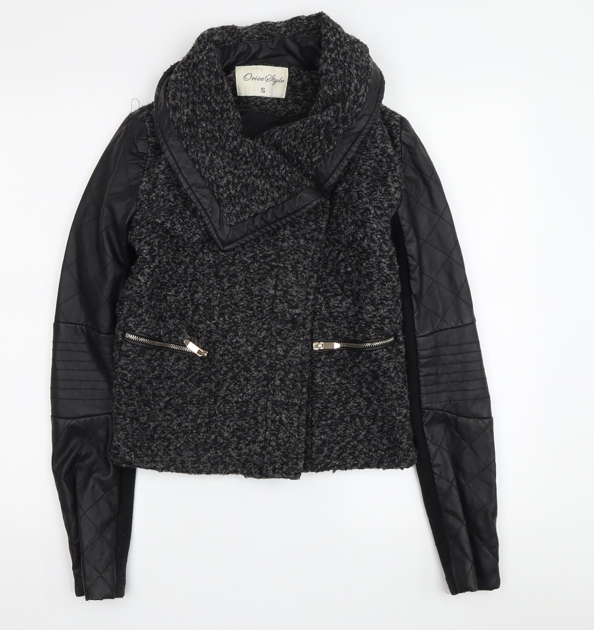 Step out in style this season with the Orice Style Women's Quilted Black Biker Jacket. Crafted for modern trendsetters, this striking jacket combines a chic, edgy look with practical features, making it a must-have addition to your outerwear collection. The jacket's elegant black hue is versatile, effortlessly enhancing any outfit for both casual and semi-formal occasions. Made from high-quality polyester, the jacket promises durability and comfort, ideal for brisk autumn and winter days. Its quilted pattern adds a touch of uniqueness, bringing together fashion and function in one sophisticated garment. Featuring convenient zipped pockets, this jacket ensures you have space to keep your essentials when you're on the move. The zip closure enhances its practicality while ensuring that the jacket fits snugly for a flattering silhouette. Specifically tailored for women, it promises a regular fit that’s both comfortable and stylish. Available in size small, it's perfect for those looking to emphasize their shape without compromising on comfort. Whether heading out for a casual outing or a weekend adventure, this jacket is designed to complement your lifestyle while keeping you warm. With minimal visible wear, it remains in excellent used condition. Make a statement and elevate your fashion game by embracing the urban, street-smart style of this quilted biker jacket, perfect for adding a bit of edge to your everyday ensemble.