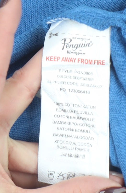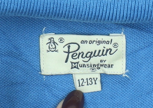 This stylish Original Penguin Boys Blue Polo Shirt is a casual wardrobe essential perfect for everyday wear. Crafted from 100% soft cotton fabric in a breathable jersey texture, it ensures comfort and durability, ideal for active kids. The shirt comes in a rich 'Deep Water' blue shade, accented by a crisp white chest stripe featuring the iconic ‘Original Penguin’ logo print. Its short sleeve design and comfortable regular fit make it a great choice for layering or wearing on its own throughout spring and summer.The polo features a traditional collared neckline with a classic two-button placket, providing a timeless yet sporty aesthetic that’s easy to style. The button-down collar adds structure, while the breathable cotton material keeps the wearer cool and comfortable. A small embroidered Penguin logo at the hem completes the look, adding a premium touch of authenticity.Practical and versatile, this piece is ideal for school days, outings, family events or casual weekends. It’s easy to care for—machine washable for everyday convenience. The shirt’s medium fabric wash gives it a modern, laid-back appeal that matches perfectly with jeans, shorts or chinos.Condition-wise, this shirt is rated 'Excellent'—it shows minimal wear and retains strong colour and shape with no visible stains or defects. Although no retail tags are present, it looks well-maintained and ready for continued wear. The quality cotton construction ensures it remains soft and breathable wash after wash.If you’re looking for a premium yet comfortable option for a stylish young boy’s wardrobe, this blue Original Penguin Polo Shirt combines classic design, modern branding and lasting wearability. A fashionable and reliable choice for ages 12–13 years, this garment embodies the distinctive charm and craftsmanship that Original Penguin is renowned for.