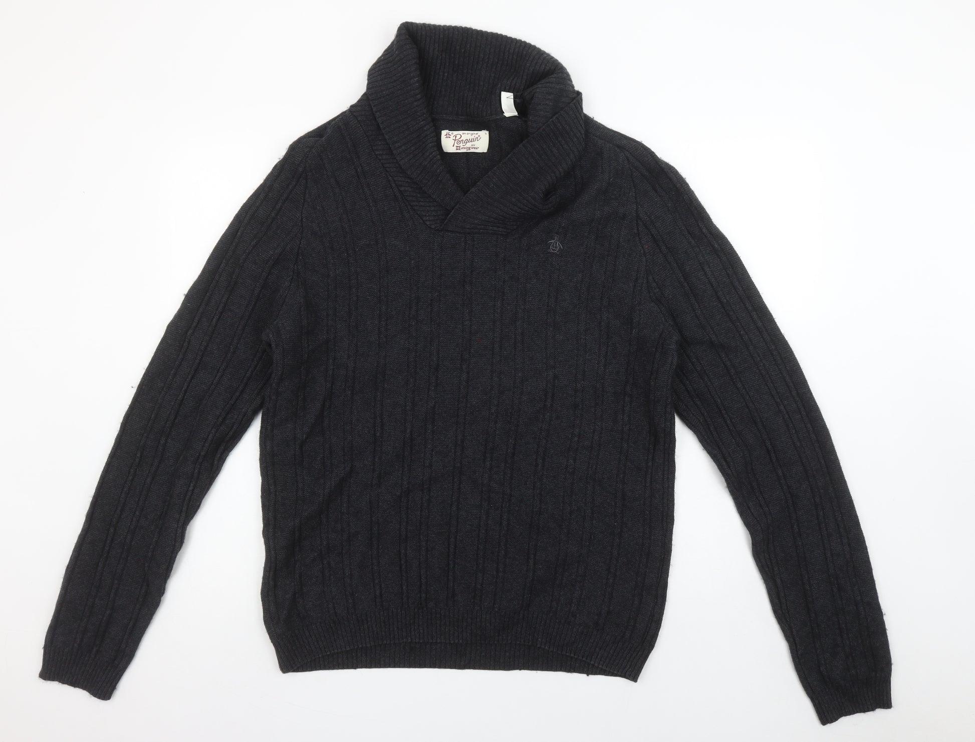 Stay comfortably stylish with this Original Penguin by Munsingwear men’s cable-knit jumper, crafted in a versatile black shade that fits effortlessly into any wardrobe. Designed with a timeless roll neckline that adds a distinctive touch and a flattering shape, this jumper brings you both sophistication and warmth for cooler days. Made from a premium blend of cotton, wool, and nylon, the fabric offers softness, breathability, and durability to ensure long-lasting wear season after season. The ribbed cuffs and hem provide a snug fit, helping to maintain the jumper’s classic structure and hold in warmth. Subtle branding decorates the chest with the iconic Penguin logo, offering understated authenticity and charm. Ideal for layering over shirts or wearing solo, it transitions easily from casual daytime looks to smart evening gatherings. Perfect for Autumn and Winter, this jumper ensures comfort whether you’re out for a casual weekend stroll, a relaxed dinner, or simply staying cosy indoors. In excellent pre-loved condition, it shows light signs of wear but remains in great shape with no visible flaws, tears, or stains. Easy to care for and machine washable, it maintains both convenience and quality. Add this effortlessly refined piece to your collection for reliable warmth and timeless appeal — a jumper that pairs as well with jeans as with chinos, making it an essential wardrobe staple for the modern man who values style and practicality.