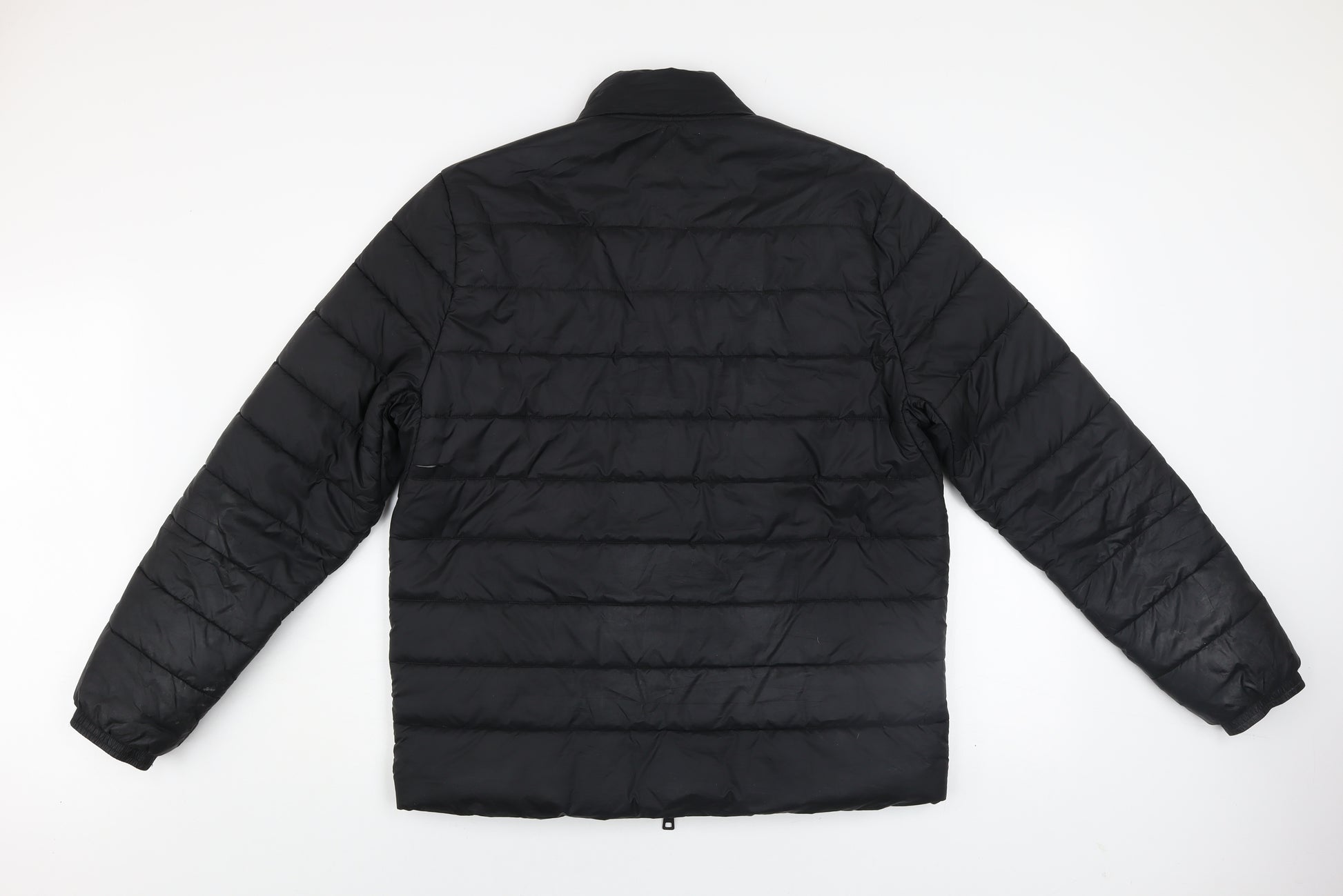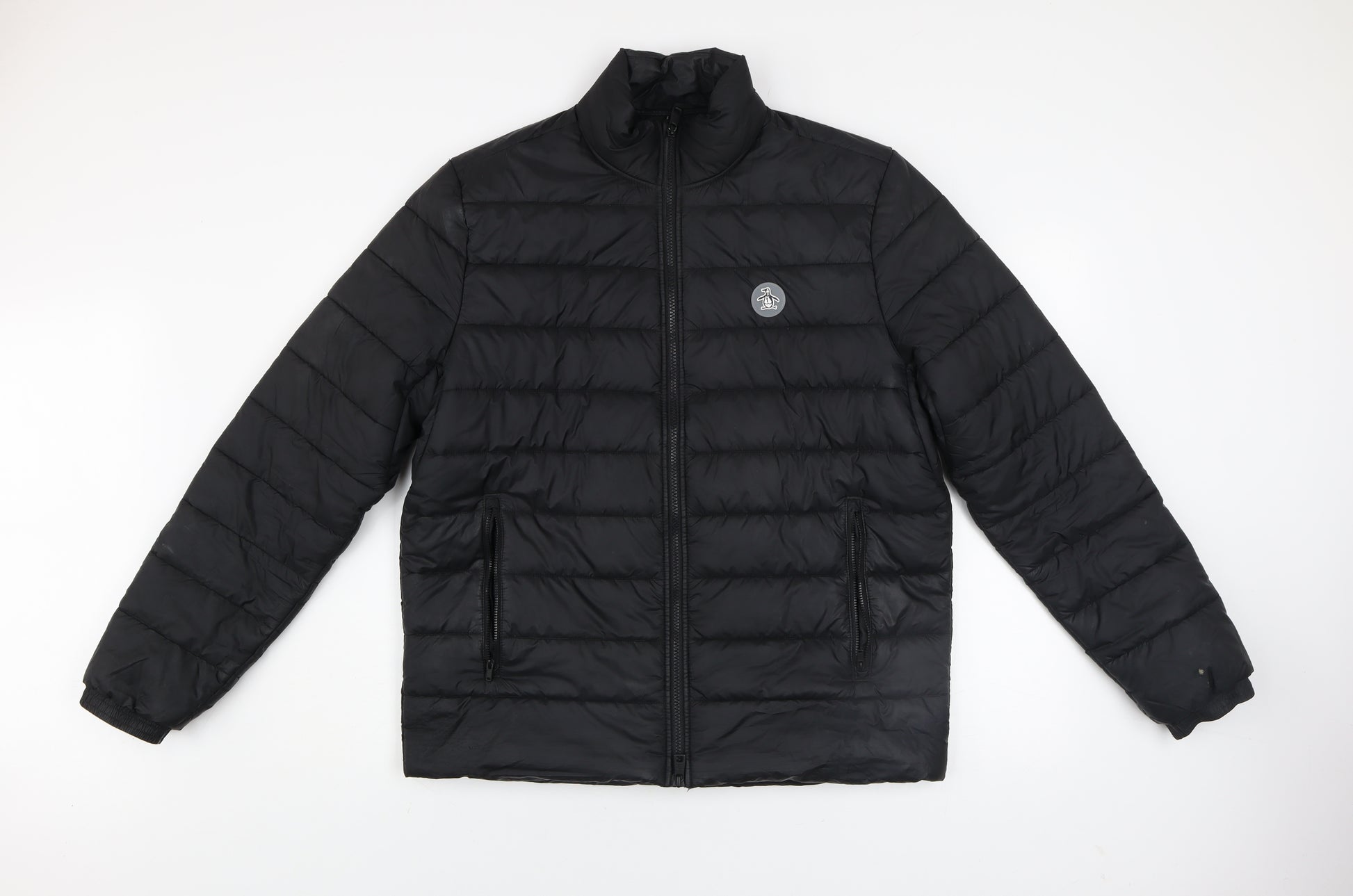 Stay comfortably warm and stylish with this Original Penguin men's black puffer jacket, a versatile essential for cooler seasons. Crafted from 100% recycled polyester, this jacket offers excellent insulation without excess weight, making it ideal for everyday wear or outdoor activities. The sleek black exterior pairs effortlessly with any outfit, while the stand-up collar and zip closure ensure a neat and weather-resistant finish. Designed with practicality in mind, the jacket features two zipped front pockets that provide secure storage for essentials, as well as lightweight padded construction for optimal warmth. The lined interior and classic quilted pattern lend both comfort and durability, perfect for lasting wear. This mid-length puffer jacket provides a regular fit that layers easily over casual or smart-casual outfits, making it suitable for commuting, walking, or travel. The signature embroidered penguin logo on the chest adds a subtle branded touch and enhances the jacket’s timeless design. With its reliable warmth and relaxed feel, it’s perfect for autumn and winter. Although pre-owned, the jacket remains in good condition with only a small tear near one pocket and light signs of use on the sleeves. Machine washable for easy care, this jacket combines functionality, sustainability, and style in one smart piece. A practical addition to any wardrobe, it promises comfort and easy wear season after season. Whether worn with jeans, chinos, or joggers, this jacket will keep you looking sharp and feeling warm wherever you go.