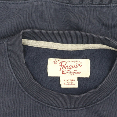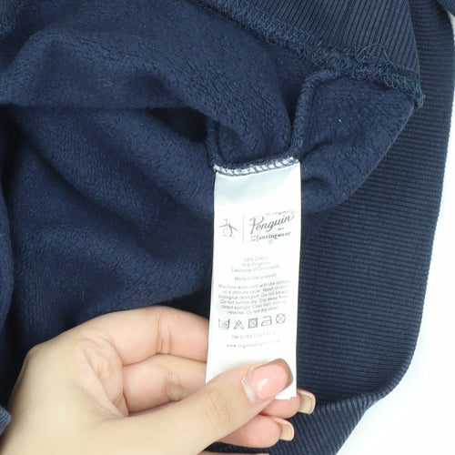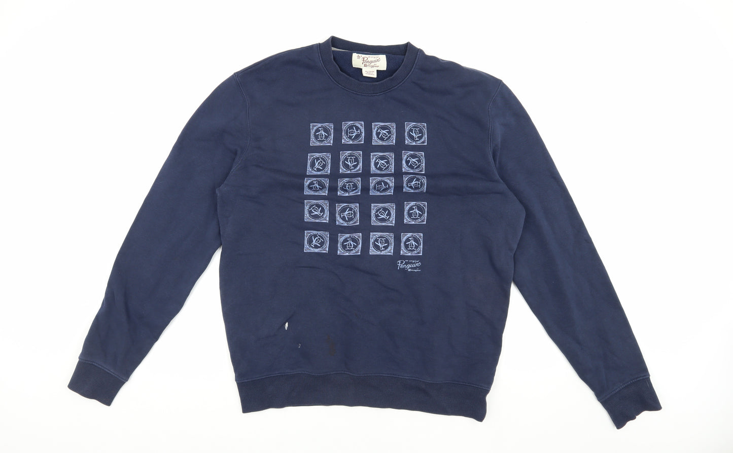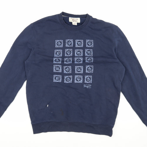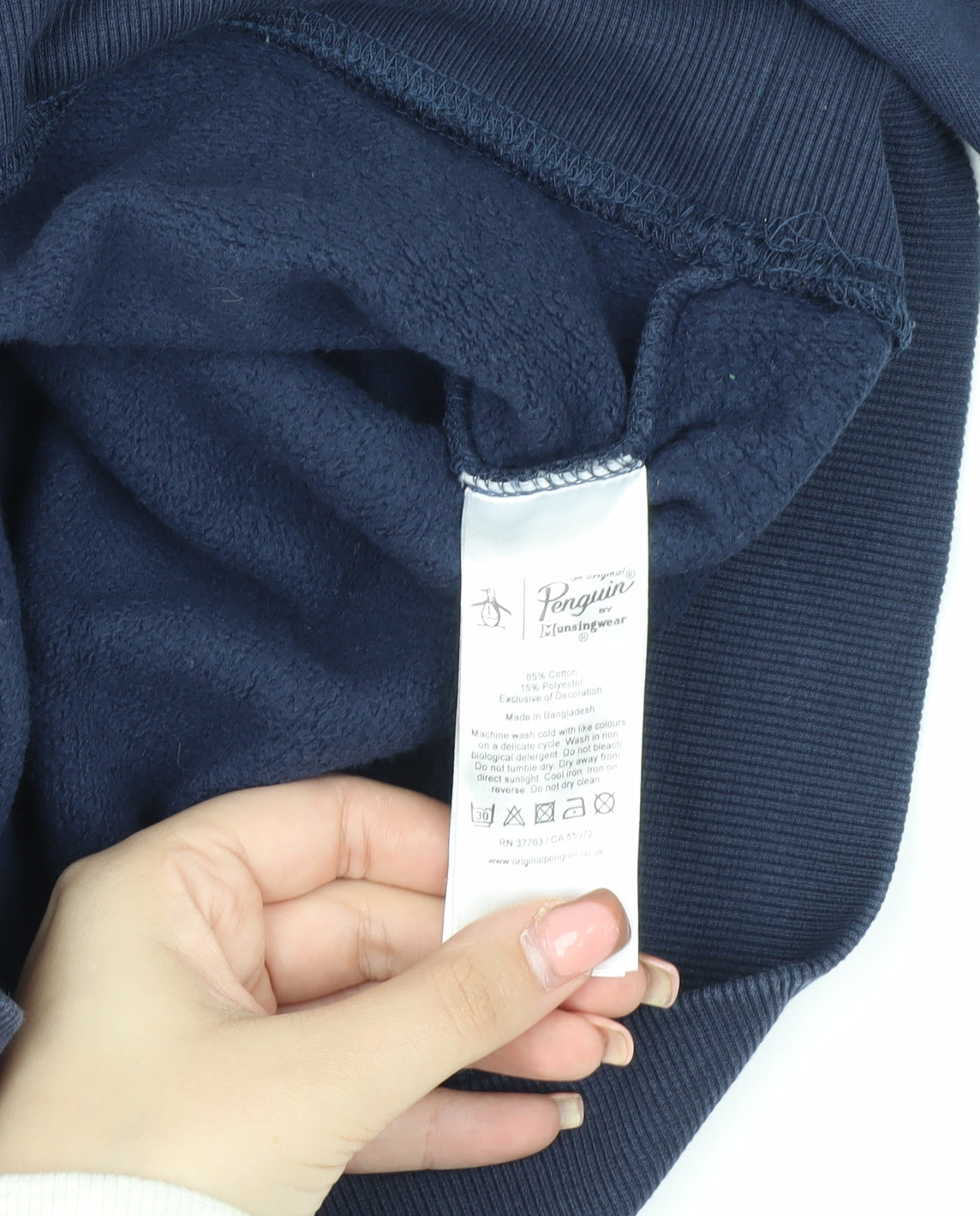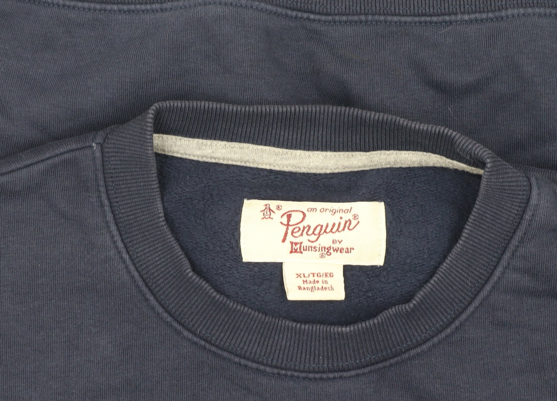 Discover timeless casual style with this Original Penguin pullover sweatshirt, designed for the modern man. This classic blue sweatshirt, crafted from a comfortable blend of 85% cotton and 15% polyester, offers a relaxed fit that is perfect for everyday wear. The fleece fabric ensures warmth, making it an ideal choice for cooler days.Featuring a distinctive graphic print accented with the iconic Original Penguin logo, this pullover adds a touch of personality to your casual wardrobe. The crew neck design, paired with long sleeves, provides a traditional look that never goes out of style.This sweatshirt belongs to the men's department and fits a regular size XL, ensuring comfort without compromising on style. It is machine washable, offering easy care and maintenance.Despite a slight tear on the front, it remains in good condition, ready to provide style and comfort for many more wears. Perfect for casual outings or lounging at home, this pullover is a must-have staple in any wardrobe.Upgrade your casual collection with this versatile Original Penguin sweatshirt, combining style, comfort, and the brand's unique flair.