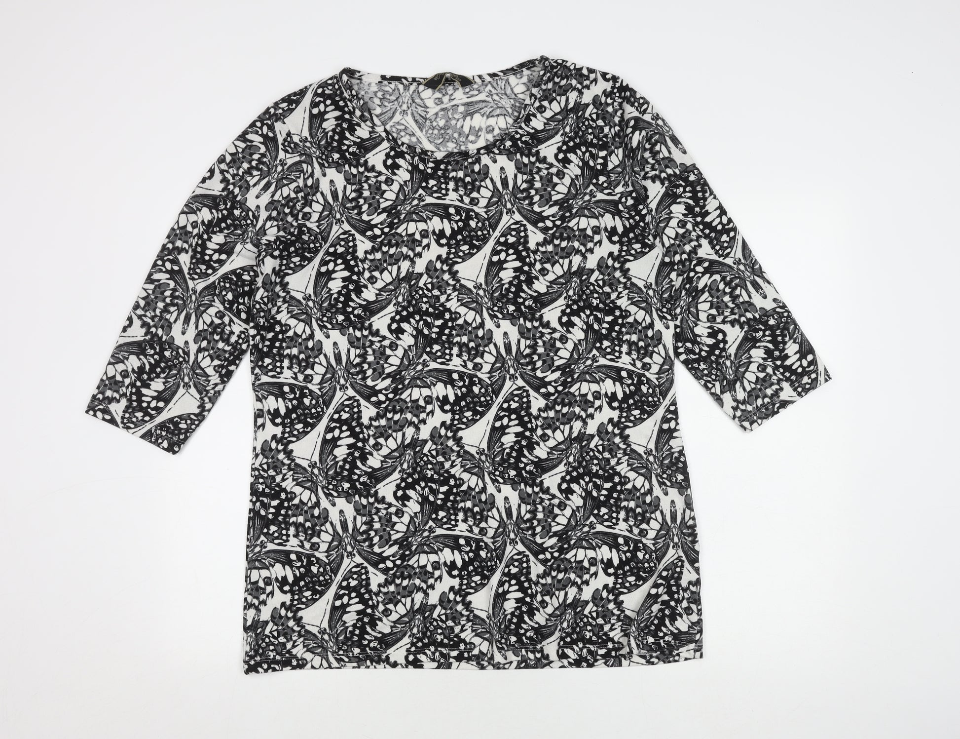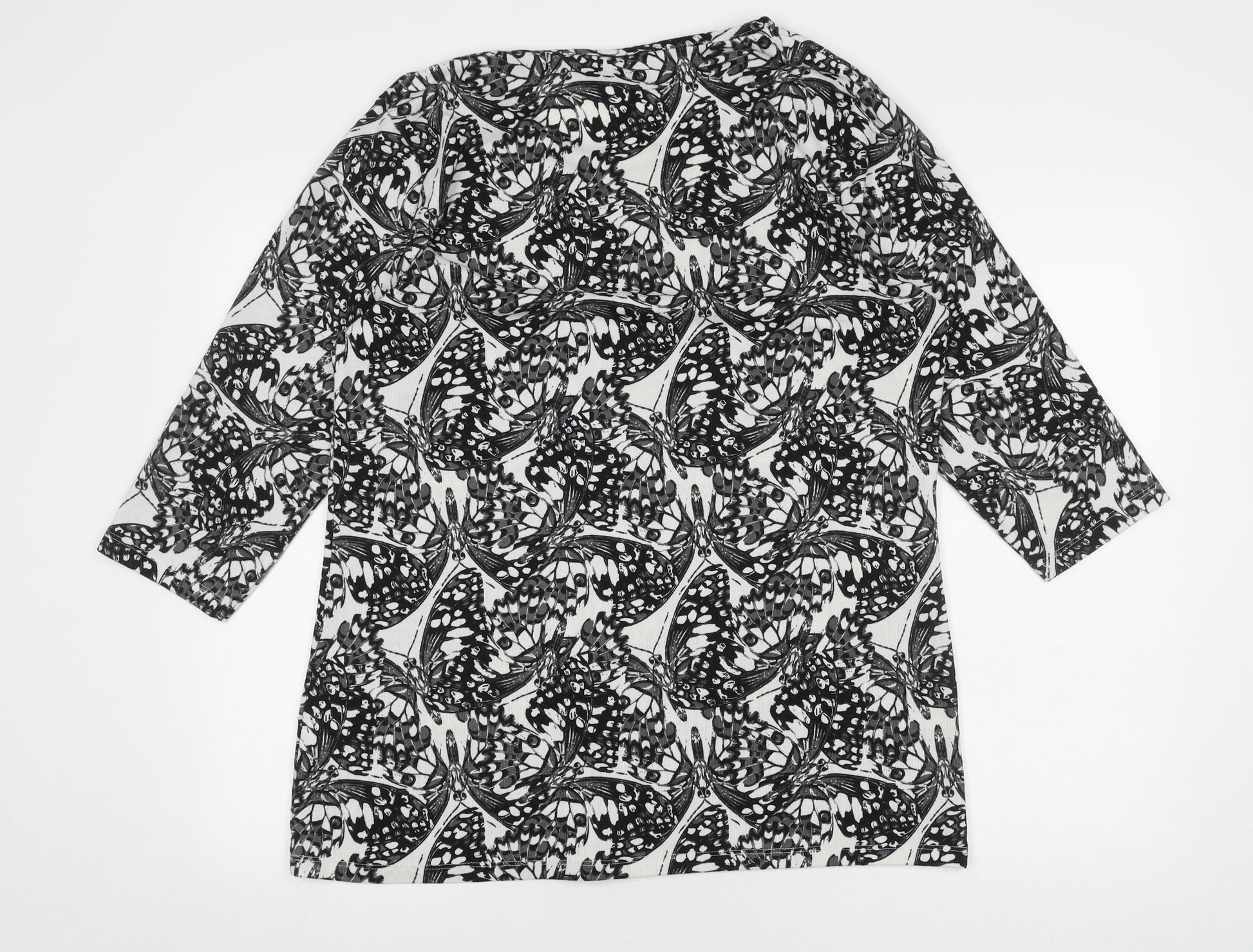 Elevate your wardrobe with this captivating black butterfly print top from Originals. Perfect for adding a touch of elegance and nature-inspired beauty to your look, this top features a distinctive animal print pattern that sets you apart with style. Crafted with a comfortable blend of viscose and elastane, it offers a lightweight and stretchy feel, making it suitable for various occasions. The 3/4 sleeve design provides just the right amount of coverage while keeping you trendy and agile. Designed with a round neckline, it offers a classic yet modern silhouette that flatters any body shape. The intricate butterfly design brings an air of sophistication and whimsy, perfect for pairing with either casual or more formal attire. Sized at 12, it's tailored for women who appreciate both comfort and aesthetics. Whether you're headed to a casual outing, work, or a weekend get-together, this top seamlessly transitions to suit the occasion. In excellent condition, this pre-owned piece has been well-maintained, promising you durability and continued wear. Its rich colour and intricate print remain vivid and fresh, ensuring you look your best each time you slip it on. Don't miss out on the opportunity to enhance your ensemble with this versatile and stylish addition to your collection.