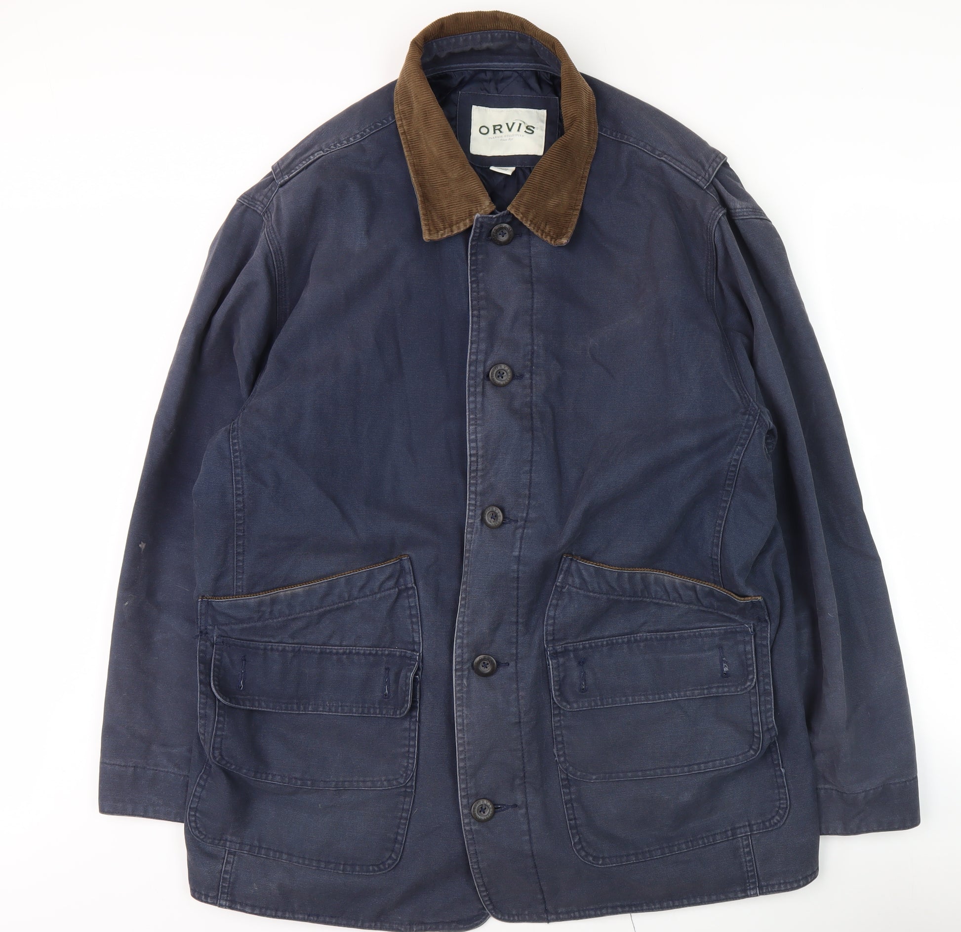 Explore the timeless style and comfort with this Orvis Men's Blue Basic Jacket in a versatile XL size. Crafted from 100% cotton, this jacket provides a soft, breathable experience perfect for casual outings in autumn and winter. The classic design features a collared neckline and mid-length cut, offering both style and practicality. Keep your essentials at hand with spacious pockets, while the button closure adds a touch of traditional elegance. Lined with 100% polyester, the jacket ensures added warmth and comfort during cooler seasons. Ideal for casual occasions, this jacket’s regular fit accommodates layering, making it a flexible addition to any wardrobe. The rich blue color offers versatility, pairing effortlessly with various outfits. With its minor wear conditions, this piece maintains a very good quality, appealing to style-conscious buyers looking for enduring fashion. Machine washable, this garment simplifies maintenance without compromising on style. Elevate your seasonal wardrobe with this Orvis jacket and enjoy a blend of classic allure and modern functionality.