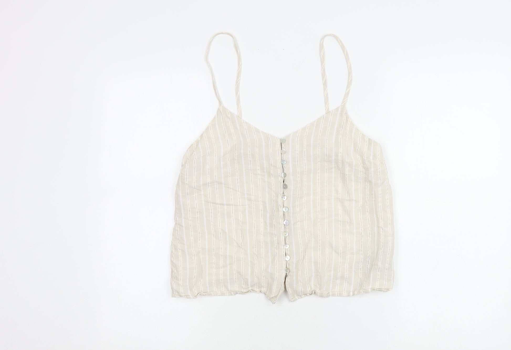 Discover simplicity and elegance with the Oshio Women's Beige Striped Linen Tank Top in size M. Tailored for women, this charming top merges comfort with style, crafted from a blend of 59% linen and 40% viscose, offering a cool and breathable fit ideal for warm weather. The tank top features a flattering V-neckline and spaghetti straps, emphasizing a casual yet chic look suitable for any laid-back occasion. The subtle beige hue is highlighted by a delicate striped pattern, adding interest without overpowering your ensemble. Complete with button accents, this top exudes understated grace that’s adaptable for both casual outings and relaxing at home. Machine washable for easy care, it remains in excellent condition, free from visible flaws, providing comfort and style in every wear. Ideal for those seeking a breezy, versatile piece, this Oshio tank top is a must-have addition to your summer wardrobe. Pair it with your favourite jeans or shorts, and sandals for a relaxed day out or dress it up with skirts and sliders for a more polished appearance. Unveil the simplicity of stylish layering with this essential piece that promises to elevate any wardrobe effortlessly.