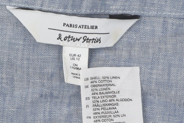 Brighten up your summer wardrobe with the chic and vibrant blue blouse from & Other Stories. Designed for casual outings, this top offers a relaxed fit that pairs perfectly with jeans or shorts. The sleeveless design ensures comfort on warm days, while the ruffle accents add a touch of femininity to your ensemble. Crafted from a high-quality blend of 52% linen and 48% cotton, it promises breathability and a soft touch against the skin. The round neckline and button closure create a classic appeal, making it a versatile piece suitable for both day and evening wear. Easy to care for with its machine washable fabric, this blouse is ideal for everyday use without the hassle of complicated maintenance. Tailored for women size 14, the blouse's regular fit complements various body types, ensuring you feel confident and stylish. Perfect for casual occasions, this elegant top is a must-have addition to your collection. Add a splash of colour to your outfit with the ever-stylish & Other Stories blouse, designed to keep you at the forefront of fashion.