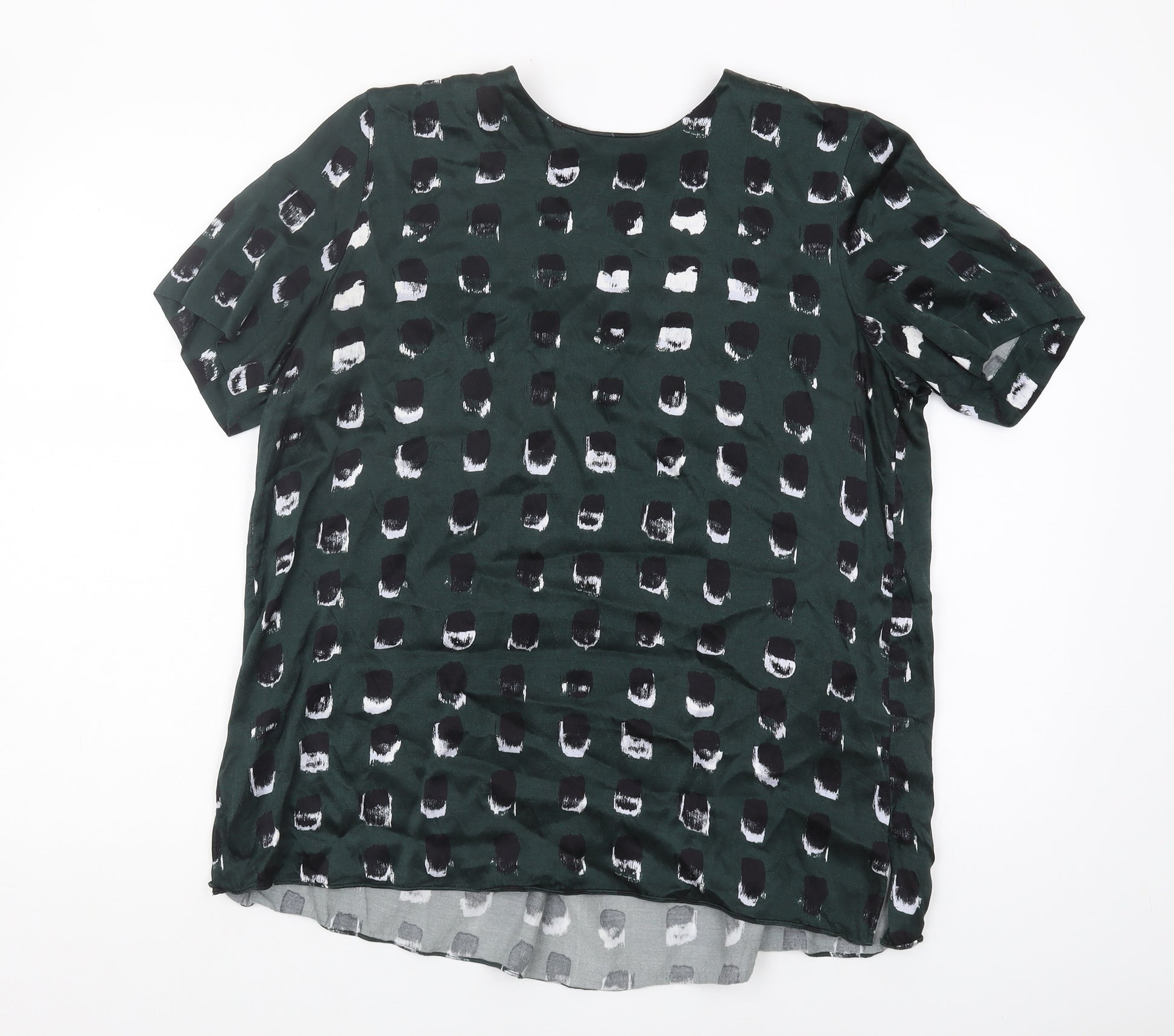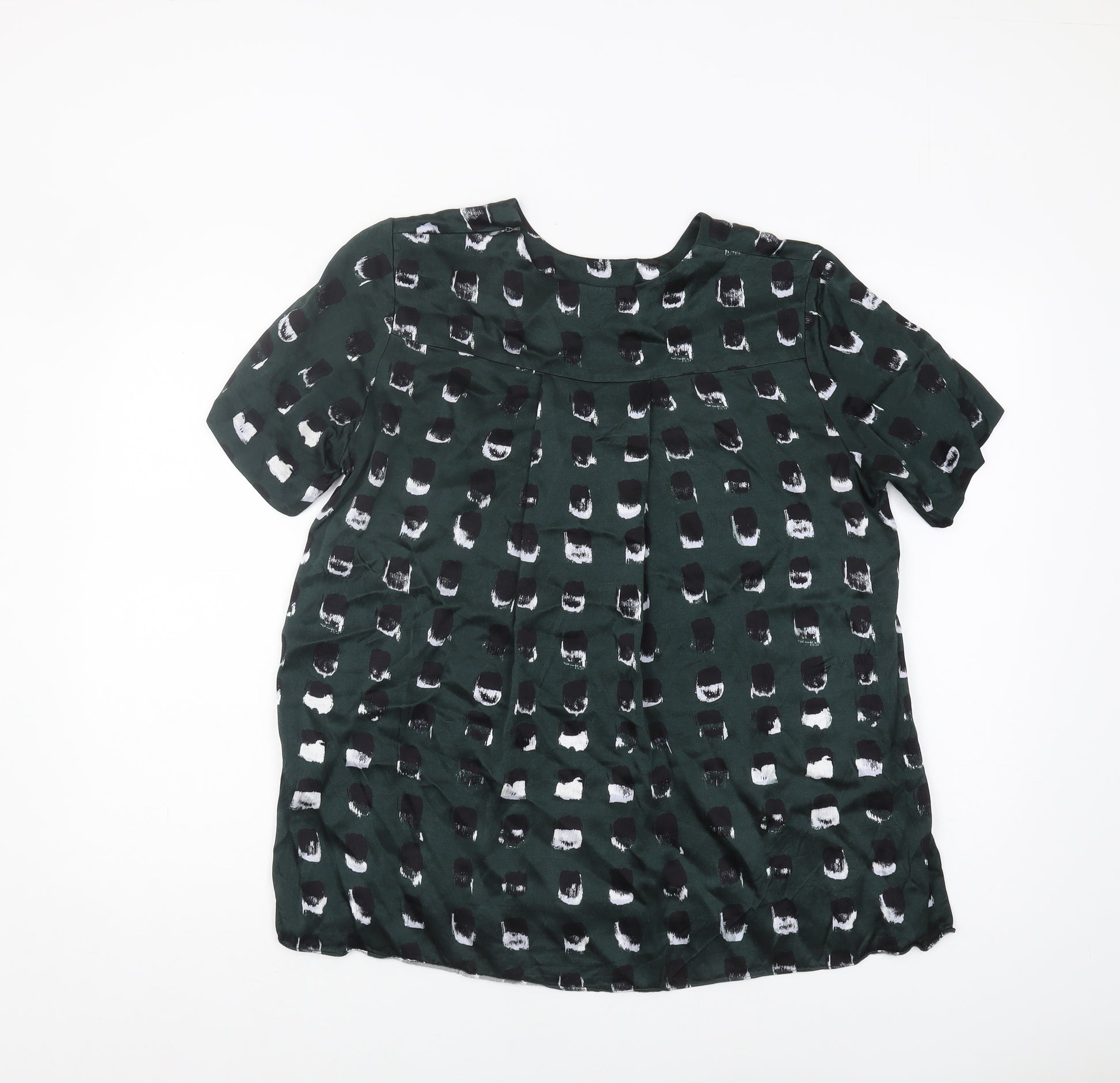Elevate your wardrobe with this chic & Other Stories Women's Geometric Blouse, perfect for casual outings and stylish enough for a creative office setting. Crafted from 100% Viscose, this green blouse combines modern aesthetics with effortless comfort. The short sleeves and round neck add a touch of classic elegance to your outfit, while the geometric pattern offers a trendy twist. Designed for the regular size type, this piece ensures a comfortable fit for size 12. The viscose fabric ensures breathability and a soft feel against your skin, ideal for spring seasons. This versatile blouse can effortlessly transition from a casual day look to an evening ensemble. Although in excellent used condition, it exhibits no visible damages, maintaining its original allure. Easy to maintain, simply machine wash to keep it looking fresh. Get ready to make a stylish impression wherever you go with this fashionable blouse.