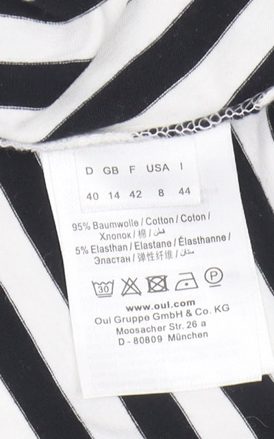 Step into effortless style with this chic Oui women's shift dress, perfect for casual outings in the warmer months. Designed in a classic black and white striped pattern, it's tailored with half sleeves for a sophisticated touch. The dress sits in a comfortable V-neckline, enhancing its relaxed and elegant appeal. Crafted from a soft jersey fabric blend of 95% cotton and 5% elastane, it ensures a breathable and slightly stretchy fit. Ideal for spring and summer, it offers a laid-back yet stylish look, making it a versatile addition to any wardrobe. Machine washable for convenient care, this dress brings both style and ease, with a touch of modern flair in its asymmetrical striped details. Elevate your casual game with this staple piece.