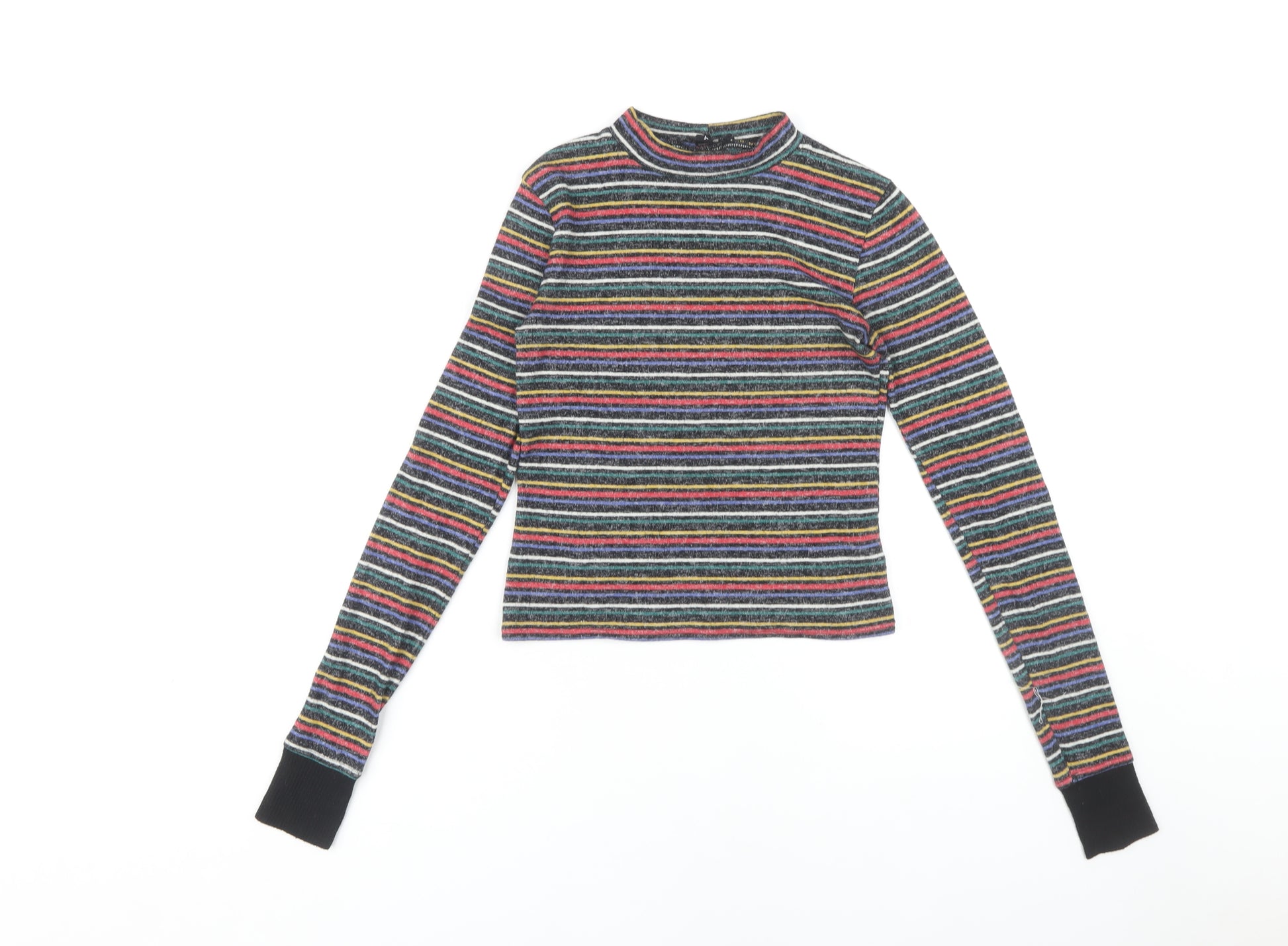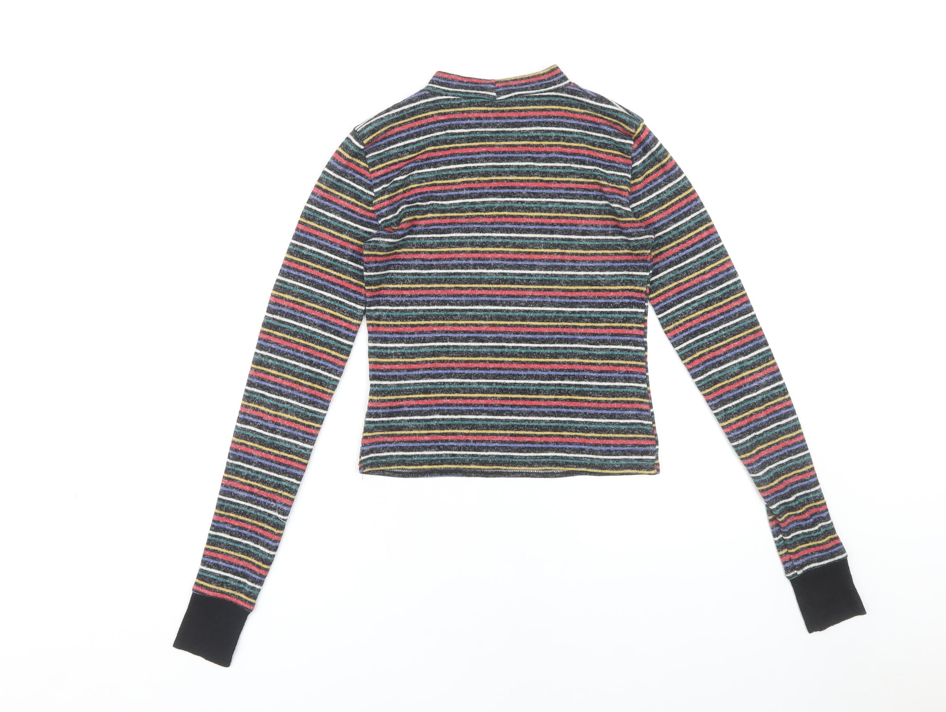 Upgrade your wardrobe with this striking multicoloured striped long sleeve T-Shirt from Out From Under. Specifically designed for unisex adults, this top is perfect for those seeking a casual, laid-back style with a modern twist. The vibrant mix of colours evokes a playful charm, making it a distinctive piece for all seasons. Crafted with a blend of 76% rayon, 21% polyester, and 3% spandex, the shirt ensures a comfortable fit that drapes wonderfully on the body. The use of high-quality materials makes it both light and breathable, ideal for casual outings or leisurely activities.Featuring a classic yet edgy mock neck, this T-shirt adds a touch of sophistication to any casual ensemble. The long sleeves offer a bit of extra warmth and style during cooler days, while the striped pattern is classic yet visually appealing, sure to make a statement wherever you go. With its pullover closure, this shirt offers ease and simplicity when getting dressed, reflecting both practical design and contemporary fashion.The regular fit of this garment allows for a balanced silhouette, effortlessly complementing various body types. Ideal for a casual occasion, this durable T-shirt maintains its excellent condition with no visible signs of wear or damage, making it a worthwhile addition to your collection. With its machine washable fabric, maintaining this top is as simple and hassle-free as wearing it.Embrace the playful elegance and versatility of this Out From Under long sleeve tee—perfect for pairing with jeans, shorts, or a skirt, transitioning seamlessly from day to night and suitable for both autumn strolls and winter layering. Don't miss the opportunity to own this eye-catching, high-quality top that combines style, comfort, and convenience in one perfect piece, offered at an attractive price point.