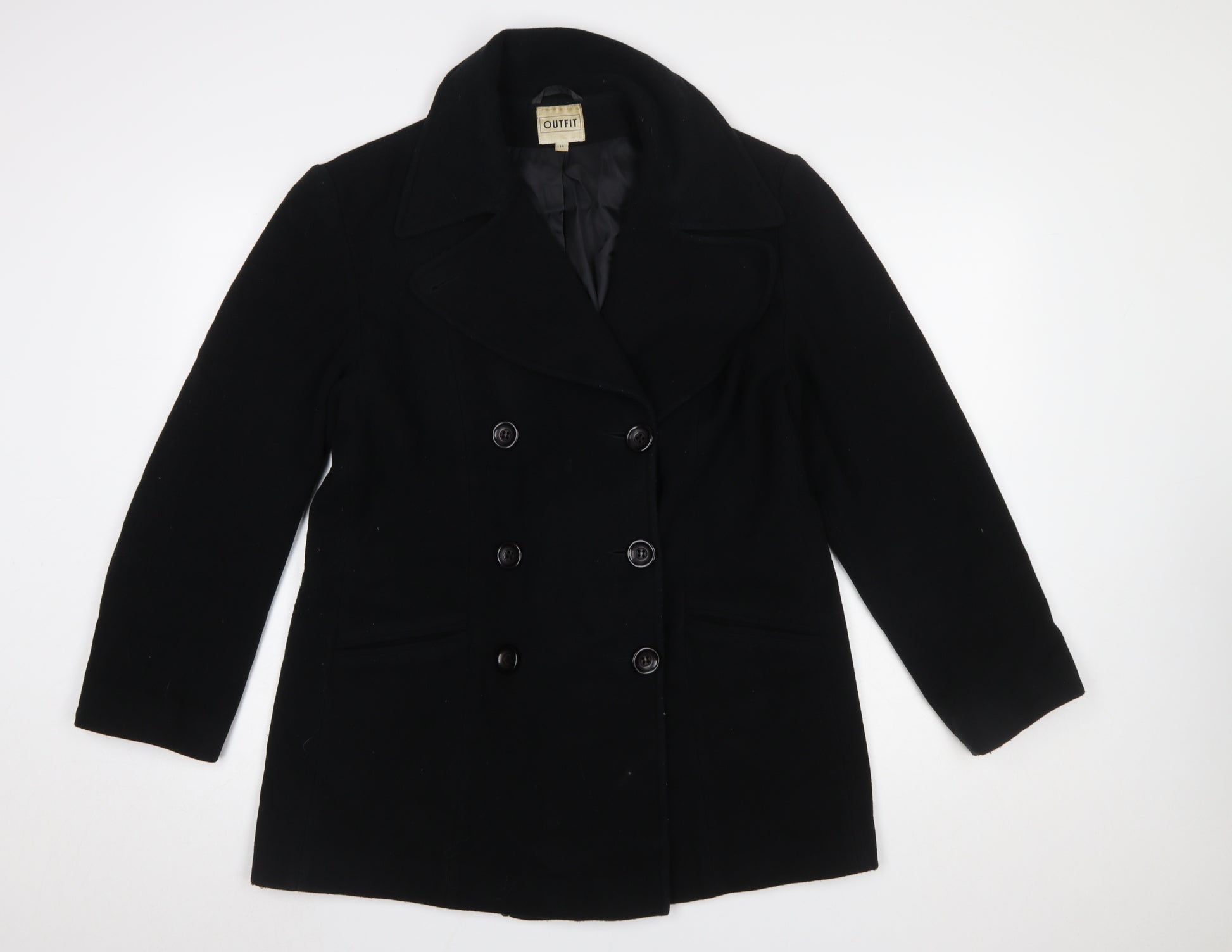 Stay effortlessly stylish and warm with this classic black pea coat from Outfit, tailored specifically for women in size 14. Crafted from a premium blend of 70% wool, 20% polyamide, and 10% cashmere, this sophisticated coat delivers both comfort and durability. The timeless double-breasted design with button fastening offers a structured silhouette ideal for the cooler months. Designed in the UK, it provides a soft, luxurious feel, complemented by a fully lined 100% nylon interior for added comfort. The mid-length cut and collared neckline enhance its polished, versatile appeal, making it an easy match for both casual and smart outfits. Perfect for autumn and winter wear, it layers beautifully over knitwear and tailored separates. The coat’s clean, minimalist design ensures a flattering fit while maintaining effortless elegance. Ideal for daily wear, commutes, or business-casual occasions, this piece combines practical warmth with sophisticated detailing. Presented in excellent pre-loved condition, it shows only minimal signs of use, ensuring it remains a long-lasting addition to any wardrobe. A wardrobe essential for those who appreciate timeless outerwear that balances heritage charm with modern refinement. Pair it with dark denim and boots for a casual look, or over a dress and heels for a chic evening ensemble. This Outfit Wool Cashmere Blend Pea Coat encapsulates understated British style — smart, versatile, and flawlessly crafted for enduring wear.