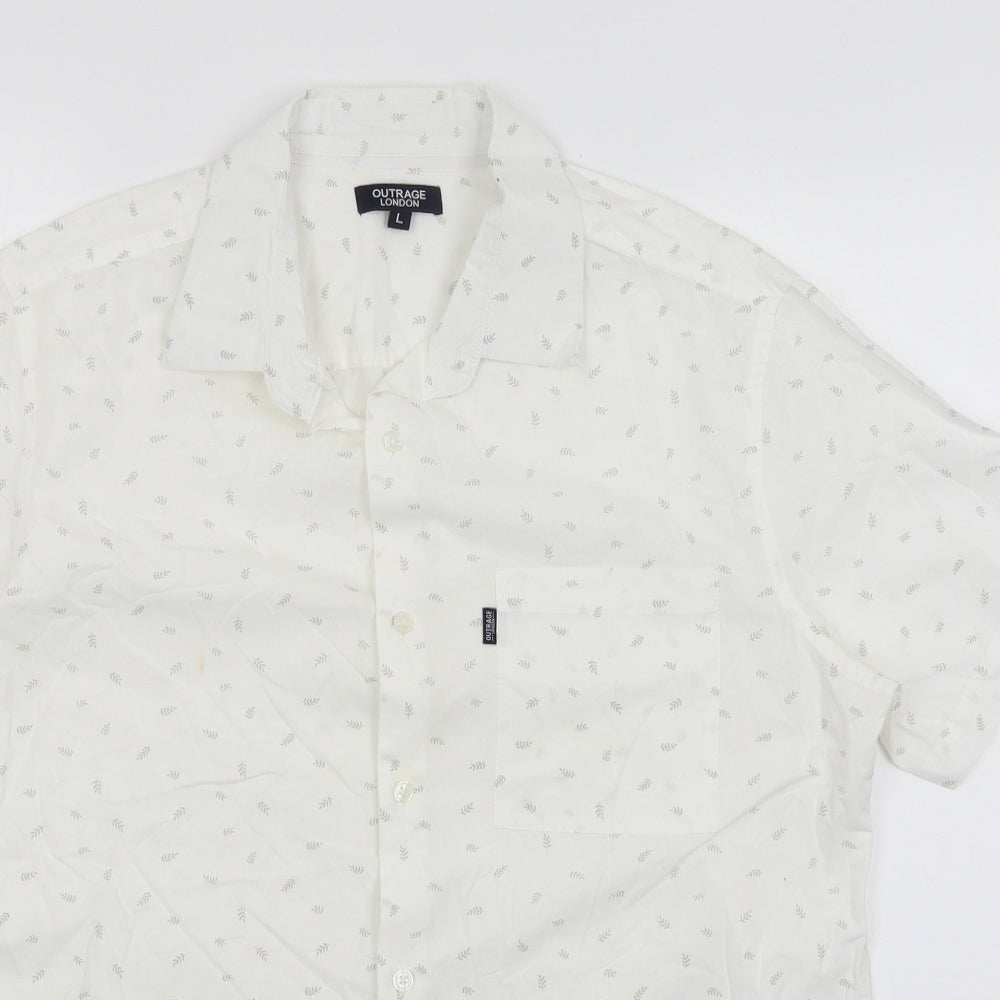 TU Mens White Geometric Linen Button-Up Size L Collared Button - Leaf Print