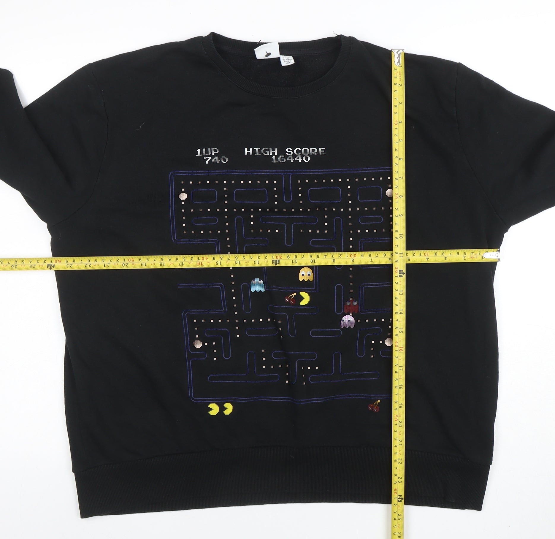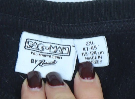Bring a touch of retro arcade nostalgia into your wardrobe with this Pac-Man by Bravado men's black sweatshirt. Styled in a timeless pullover design with a classic crew neckline, this piece celebrates one of the most iconic video games ever made. The soft fleece fabric combines durability and comfort, making it ideal for everyday wear while keeping you warm through the cooler months. Crafted from a quality cotton and polyester blend, it offers a lightweight yet cosy feel perfect for layering during autumn, winter, and spring. The striking embroidered Pac-Man and ghost maze graphic adds a bold and playful look that will appeal to any gaming enthusiast or pop culture fan. Designed in size 2XL, it fits comfortably for those seeking a relaxed, regular silhouette. The ribbed cuffs and hem provide gentle structure while maintaining excellent shape retention. With its unique vintage-style theme featuring bright, colourful detailing on a black background, this sweatshirt pairs effortlessly with jeans, joggers, or casual trousers for a laid-back style. Whether you're lounging at home, heading out with friends, or reliving classic gaming memories, this piece offers both style and character. It’s machine washable for easy garment care and built with quality stitching for long-lasting wear. Despite its pre-loved condition, it looks clean and well-maintained with only slight signs of gentle use. Perfect for collectors of retro gaming apparel or anyone wanting to make a graphic statement with their casual outfits, this Pac-Man sweatshirt is a standout addition to any casual wardrobe. A great gift idea for fans of gaming culture, the fun design brings a nostalgic twist to everyday comfort. Don’t miss out on this rare and playful piece that blends comfort, individuality, and cultural flair in one classic look.