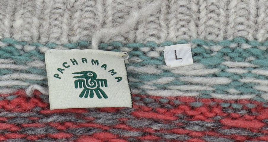Embrace the warmth and style of this exquisite Pachamama women's cardigan, perfect for the autumn and winter months. Crafted with care, this handmade knitwear features a striking Fair Isle pattern that brings a delightful burst of colour to any outfit. The cardigan boasts a collared neckline, adding a touch of elegance and structure to its relaxed, regular fit. Fashioned entirely from 100% wool, this chunky-knit cardigan provides superior comfort and insulation, making it an ideal choice for chilly days and cosy nights. Long sleeves further enhance its warmth, wrapping you in a blanket of softness. Designed in a multicoloured scheme, this cardigan effortlessly complements a range of outfits, injecting vibrant hues into your wardrobe staples. The button accents offer additional charm, alongside practicality and ease of wear. Exceptionally versatile, this Pachamama cardigan suits casual occasions, whether you're lounging at home or heading out for a leisurely stroll. With its hand-wash only care instructions, maintaining its lush texture and pattern is simple and straightforward. In excellent condition, this item is devoid of any visible damage, promising a like-new appearance. Wrap up in timeless style and unbeatable quality with this gorgeous Pachamama cardigan—a must-have piece that celebrates individual artistry and the beauty of traditional knitwear.