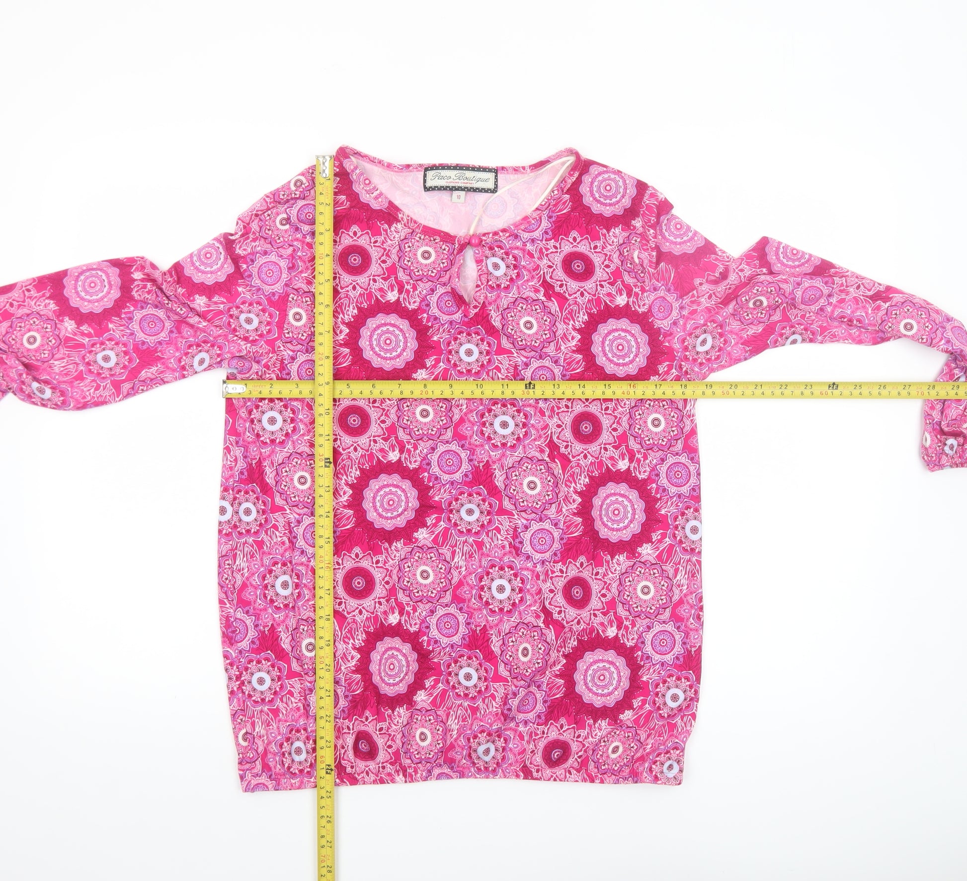 Add a splash of vibrant charm to your wardrobe with this beautiful women’s floral tunic blouse from Paco Boutique. Crafted in a soft, lightweight jersey fabric, the top features a bold pink and magenta flower pattern with delicate mandala-style accents that perfectly balance playfulness and sophistication. Made from a comfortable blend of 97% polyester and 3% elastane, it offers just the right amount of stretch to ensure a flattering and comfortable fit for everyday wear. Designed with a classic round neckline accented by a keyhole button front, this blouse embodies laid-back elegance suitable for a range of occasions. The long sleeves feature a relaxed, gently gathered cuff for an easy fit, while the tunic-style design allows flexible pairing with jeans, leggings, or tailored trousers. Perfect for spring and summer, the lightweight material ensures breathability and comfort throughout the day. The regular fit of this blouse enhances its wearability, making it ideal for casual outings, workwear layering, or weekend get-togethers. The vivid pink tones paired with its bohemian floral motif create an eye-catching piece that can easily be dressed up with statement accessories or worn simply for effortless style. Presented in excellent pre-owned condition with no visible signs of damage or wear, this blouse has been gently used and well cared for. Whether you prefer a comfortable yet stylish look or want a standout piece for your seasonal rotation, this Paco Boutique top is a versatile wardrobe favourite that blends femininity and comfort beautifully. Machine washable for easy care, this blouse remains a dependable choice for those seeking colour and flair in their everyday wear.