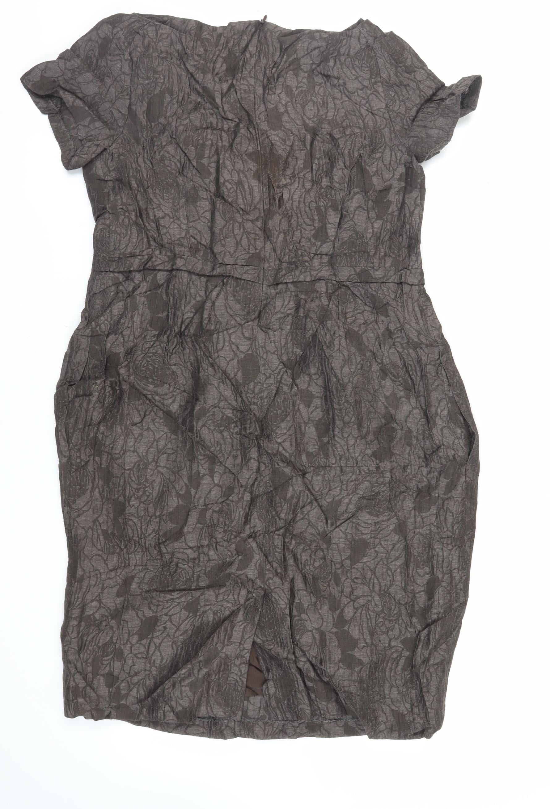 Womens Brown Floral Linen Pencil Dress Size 12 Boat Neck Zip - Lined