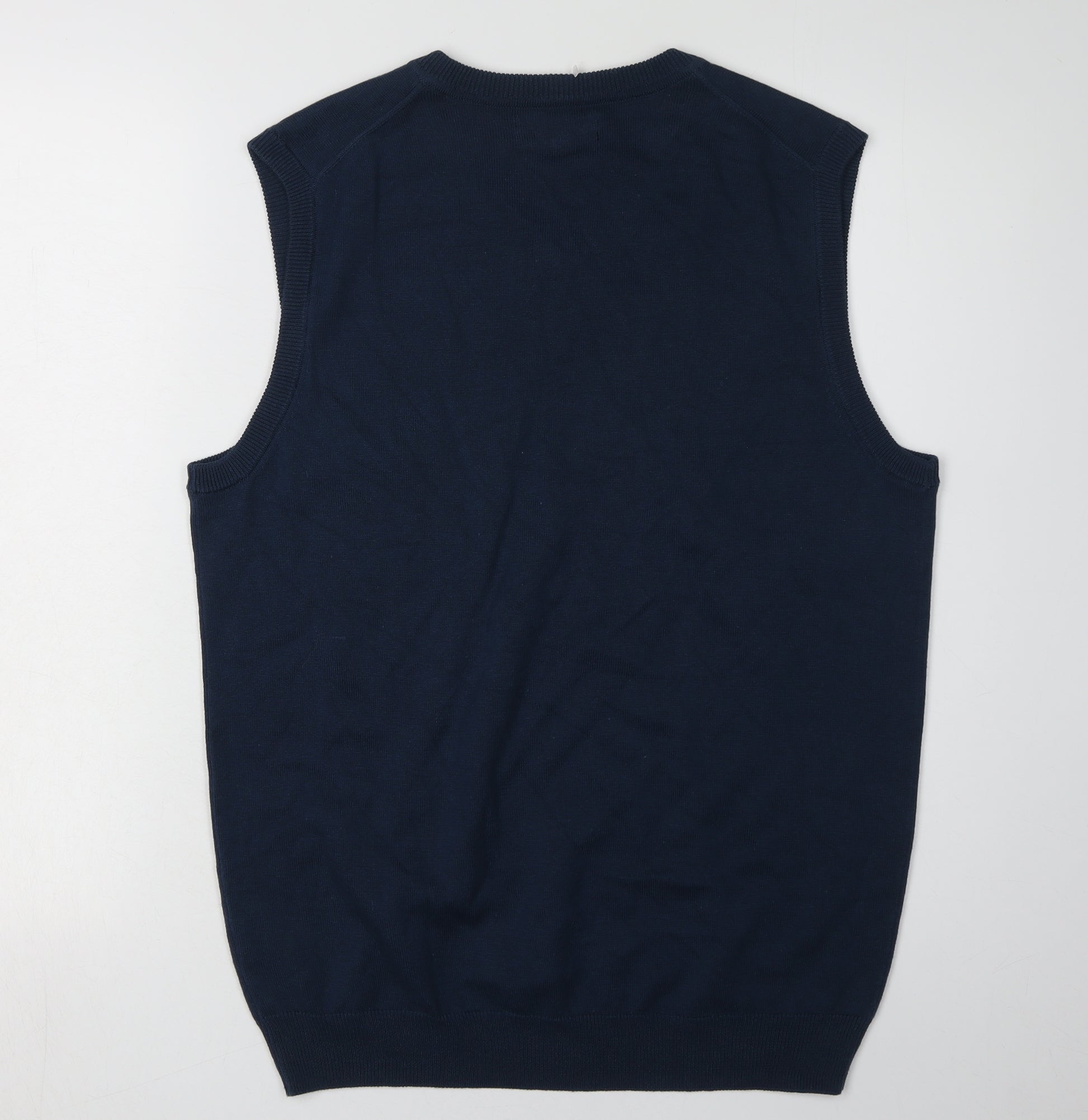 Elevate your casual wardrobe with the Palm Grove Men's Blue Vest, a perfect addition for layering during the in-between seasons of autumn and spring. Crafted from a comfortable blend of 55% cotton and 45% polyester, this vest combines breathability and durability, ensuring you stay comfortable throughout the day whether you're on the golf course or enjoying a leisurely outing. This medium-sized jumper in a sleek blue hue features a classic V-neckline, offering a touch of sophistication while maintaining a laid-back vibe. The sleeveless design is ideal for versatile styling, allowing easy layering over shirts or under blazers. Designed for regular fit, this knit vest promises comfort and ease of movement. The absence of patterns lends it a clean and minimalist aesthetic, perfect for those who appreciate subtlety. Machine washable for easy care, this garment ensures maintenance is hassle-free. Whether you're dressing for a casual occasion or seeking a relaxed vibe for your indoor gatherings, this Palm Grove vest fits seamlessly into any setting. Enhance your outfit effortlessly with this staple piece, great for both fashion-forward individuals and minimalist enthusiasts alike. With its brand new tags, this jumper promises a fresh unspoiled look and feel, making it an excellent gift option or a personal wardrobe upgrade. Experience the blend of quality, style, and comfort in this Palm Grove masterpiece.