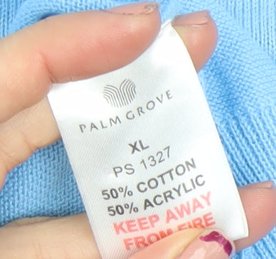 Elevate your casual golf wardrobe with this classic Palm Grove men's jumper in a refreshing light blue shade. Crafted from a comfortable and breathable blend of 50% cotton and 50% acrylic, this pullover offers a lightweight feel that’s ideal for spring, summer, and autumn wear. The knit construction ensures durability, warmth, and flexibility, making it a superb layering choice both on and off the golf course. The design features a stylish V-neckline with subtle contrasting stripes on the collar and cuffs that lend a refined sporty edge. The Palm Grove logo is discreetly embroidered on the chest, adding a touch of understated branding while keeping the look clean and versatile. The long sleeves and ribbed trims provide a comfortable fit that retains its shape through regular wear. Designed in a regular fit, it allows ease of movement without compromising on style, catering perfectly to active men who value both comfort and performance. This Palm Grove golf jumper works perfectly for casual outings, golf sessions, or relaxed social events. The lightweight fabric is easy to care for and machine washable, ensuring everyday practicality. Whether paired with chinos, jeans, or golf trousers, its sharp blue colour pairs effortlessly with neutral tones for a timeless look. Condition is excellent, showing minimal signs of previous use and well maintained, with only slight creasing noted from storage. Ideal for men seeking a smart yet laid-back wardrobe staple, this jumper delivers superior quality at an excellent value. Step onto the course or into casual settings with confidence and comfort with this Palm Grove V-neck jumper – the perfect addition to any modern gentleman’s apparel.