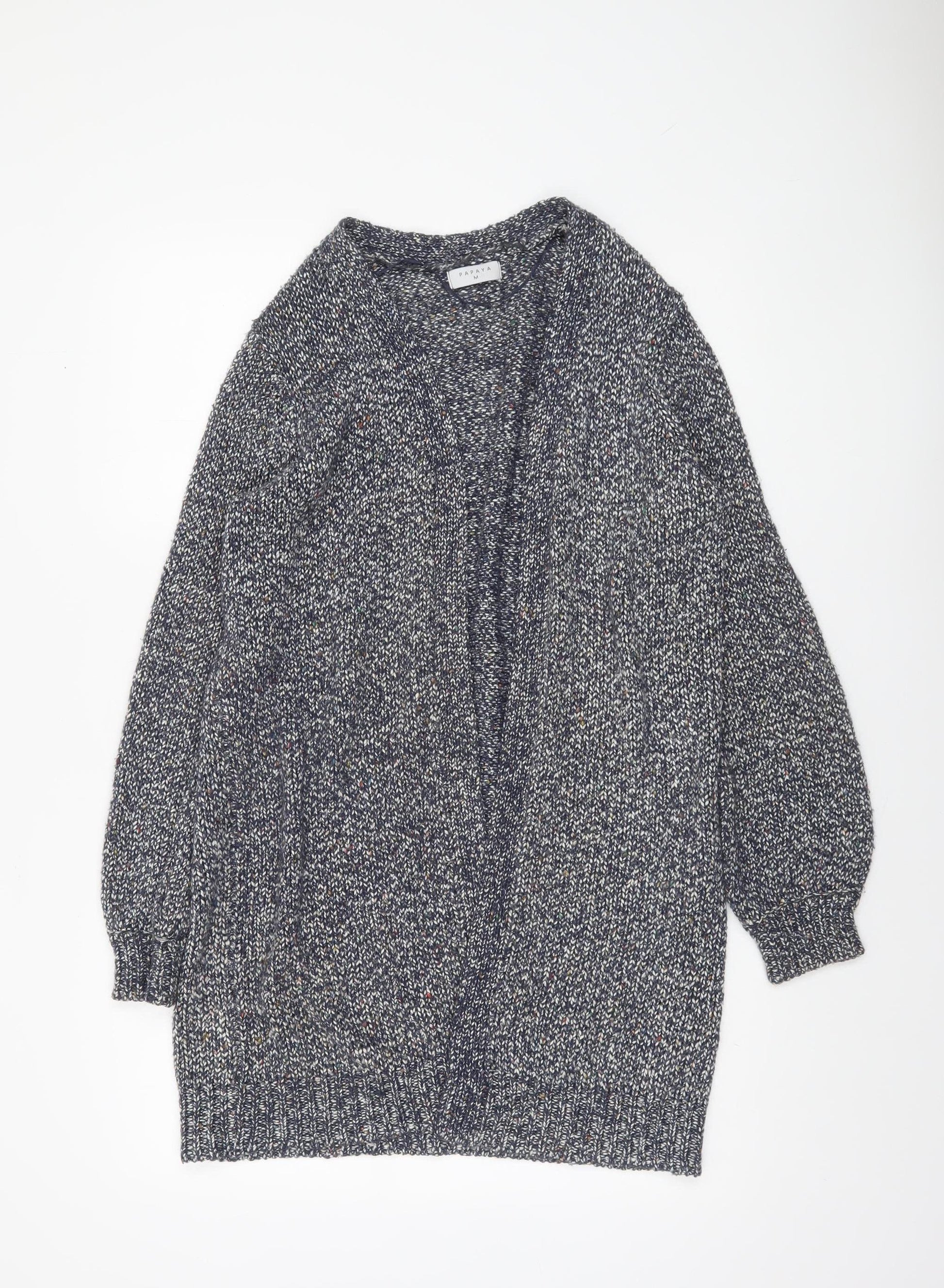 Stay stylish and snug this season with this Papaya women’s grey chunky-knit cardigan in a comfortable medium size. Made from a cosy blend of 98% acrylic and 2% polyester, this piece offers a soft and warm feel ideal for cooler autumn and winter days. Designed in a versatile open style with a relaxed fit, it layers beautifully over your favourite tops and dresses. The long sleeves and ribbed cuffs add extra comfort, while the subtle flecked yarn pattern in grey and white gives it a textured, modern look without being overpowering. Perfect for casual daily wear, this cardigan pairs effortlessly with jeans, leggings, or skirts for a relaxed yet polished outfit. Whether worn at home, for a casual outing, or layered at work, the Papaya knit offers timeless versatility. The quality fabric blend ensures it is machine washable and easy to maintain, while the knit construction provides both warmth and breathability. Despite being pre-loved, this cardigan remains in excellent condition with no visible marks or damage, promising plenty of wear ahead. It makes an affordable, fashionable addition to any winter wardrobe — a real go-to for effortless layering. Treat yourself to this comfortable and stylish piece at a great price, giving you comfort, value, and style all in one essential wardrobe staple.