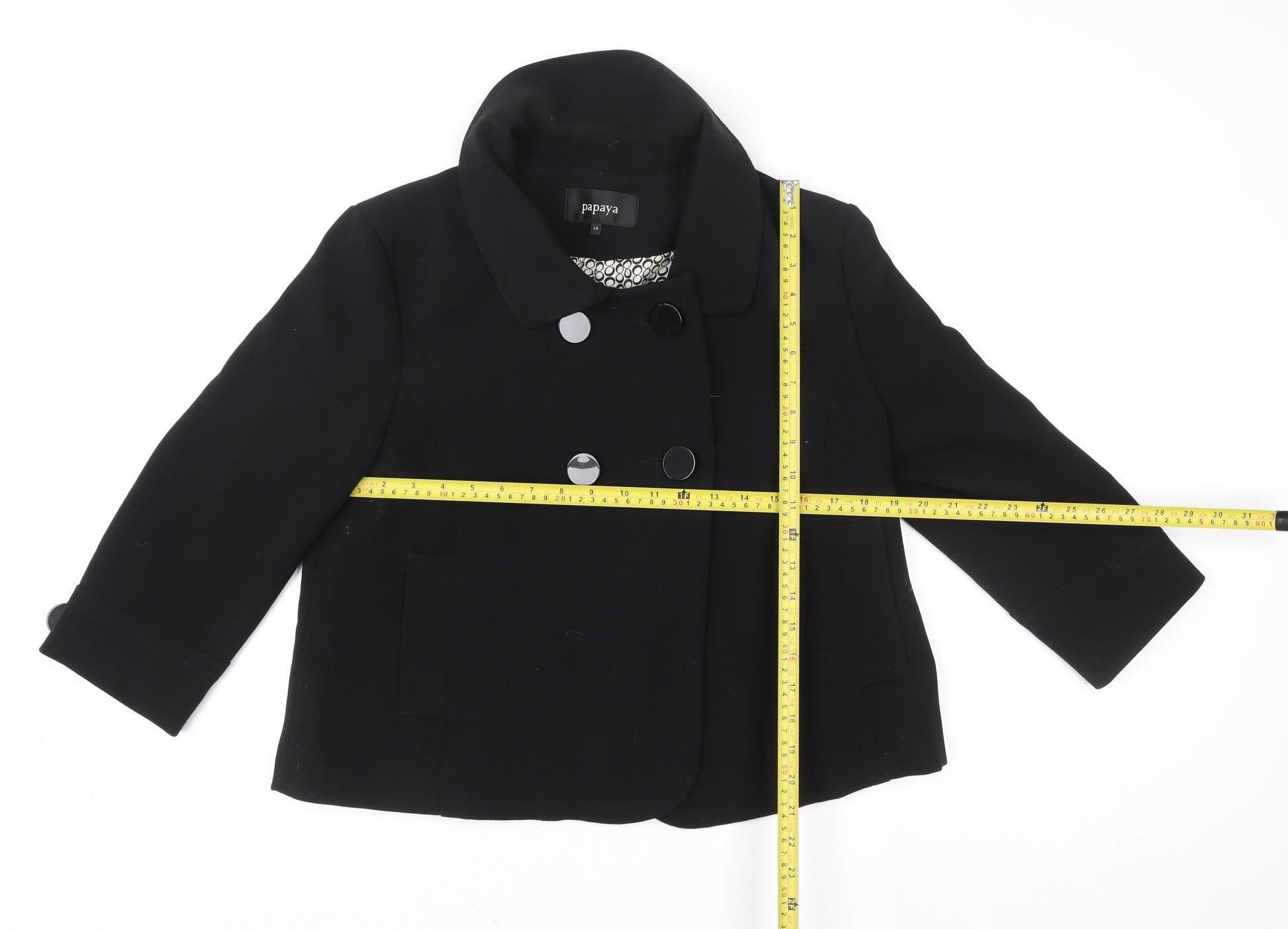 This stylish black pea coat from Papaya is a versatile addition to any woman’s wardrobe, offering a timeless look that perfectly balances comfort and sophistication. Designed in a flattering short length with a structured silhouette, it is tailored to provide a smart, chic finish suitable for both casual outings and workwear settings. Crafted from a premium blend of 68% polyester, 29% viscose and 3% elastane, this jacket combines softness and durability with a slight stretch for added comfort and flexibility throughout the day. The twill fabric gives a refined texture, complementing its classic black tone. Featuring large button fastening, a wide collar and front slip pockets, this jacket exudes minimalist elegance while maintaining practicality. The added lining enhances warmth and ensures it is ideal for autumn and winter wear. It’s perfect for layering over tops or jumpers, pairing effortlessly with trousers, dresses or jeans for a polished, everyday look. This piece is in very good pre-owned condition, showing minimal signs of wear with no significant flaws. The quality craftsmanship and versatile colour make it a wardrobe staple that transitions smoothly from office attire to casual weekend outfits. Elevate your seasonal layering with this classic Papaya short pea coat — a stylish, easy-to-wear piece offering comfort, warmth, and timeless appeal at an exceptional value.