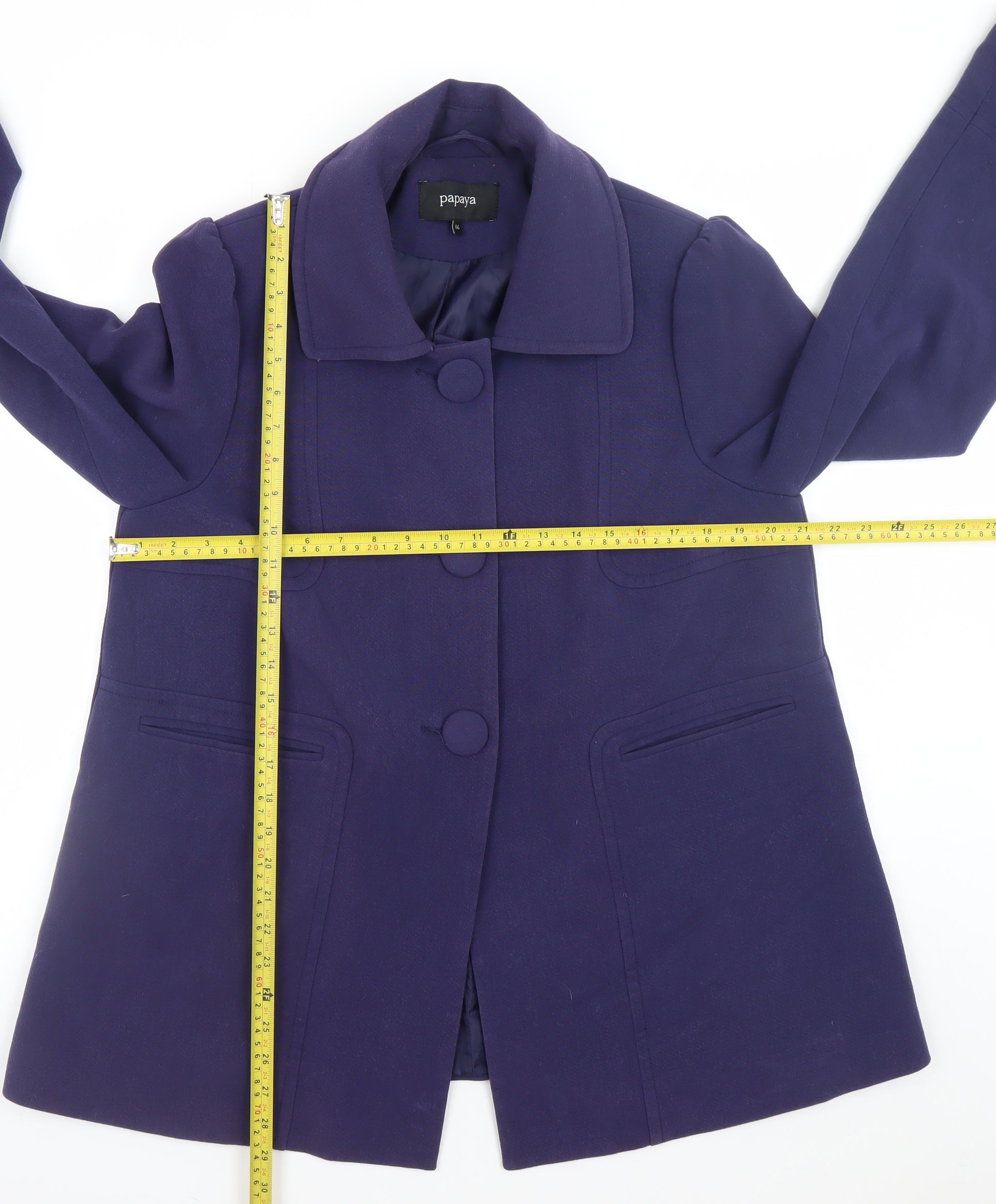 Step out in timeless style with this beautiful women's purple overcoat from Papaya. Designed for both comfort and elegance, this mid-length coat is a versatile wardrobe staple ideal for the colder months. Crafted with a blend of polyester, viscose and elastane, the coat offers durability, softness, and a touch of stretch for ease of wear. The rich purple tone adds a pop of colour while maintaining a sophisticated appearance suitable for both everyday wear and smarter occasions.The tailored cut enhances your silhouette, while the collared neckline and structured seams add a classic touch. Featuring a secure button closure and two slip pockets, it combines practicality with stylish detailing. The coat is fully lined in polyester, offering warmth and a smooth finish throughout. This design is perfect for layering over jumpers, blouses or dresses, making it an adaptable addition to any outfit. Ideal for casual outings, workwear or an evening look, it balances modern chic with everyday comfort.In excellent pre-owned condition, this piece shows minimal signs of wear and retains its sharp colour and shape. With its simple yet refined construction, this Papaya coat will elevate any outfit effortlessly. Whether teamed with jeans and boots for a day out or styled over tailored pieces for the office, it provides a polished finish suitable for any occasion. Treat yourself to a staple that blends elegance and practicality, ensuring a flattering fit and timeless appeal that you’ll reach for season after season.