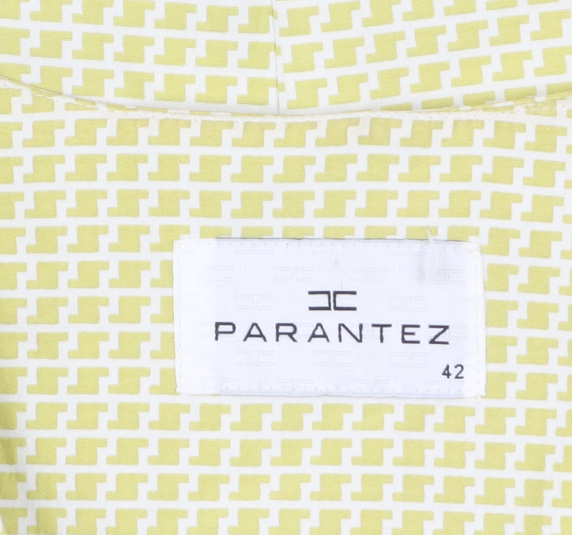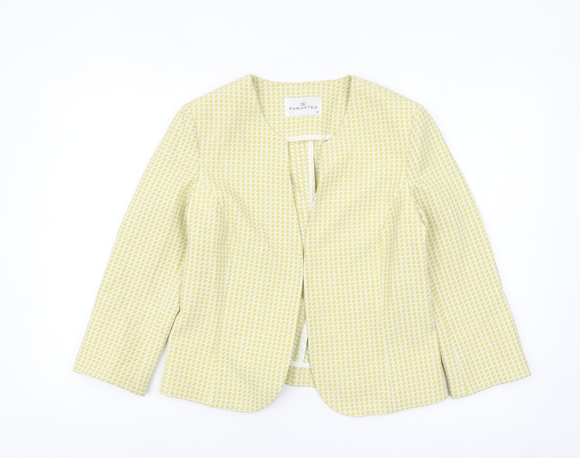 Brighten your wardrobe with this Parantez women's yellow geometric woven blazer in size 14. Perfectly tailored for a flattering fit, this single-breasted blazer combines modern sophistication with timeless appeal. Crafted from a durable yet lightweight woven blend of 97% polyester and 3% elastane, it offers a touch of stretch for added comfort and movement. The blazer features a classic geometric pattern in a cheerful yellow and white design, making it suitable for both professional and formal occasions. Fully lined with soft polyester for comfort, this piece showcases a structured shape that enhances the silhouette while maintaining ease of wear throughout the day. Ideal for spring and summer, it transitions effortlessly from office meetings to elegant evening events with style. The open front design provides a clean, minimalistic look without buttons or fuss, keeping the focus on the fabric and tailoring. Its long sleeves and regular-length cut make it versatile enough to pair with suit trousers, smart skirts, or skinny jeans. This Parantez blazer is a statement of refined confidence and polished style, perfect for the modern woman seeking classic charm with a hint of individuality. Despite being pre-owned, it remains in excellent condition with light wear and no visible defects, ensuring it will continue to impress in both professional and social settings. An ideal addition for those who value high-quality craftsmanship and versatile elegance, this blazer will swiftly become a wardrobe favourite.