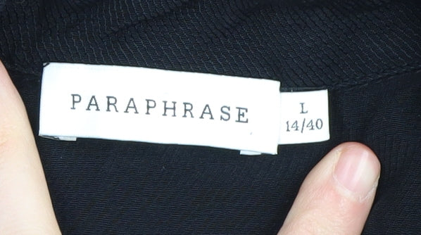 Elevate your wardrobe with this chic black dress from Paraphrase. Crafted from lightweight and breathable viscose, this dress ensures comfort and style for any occasion. The elegant lace-up detail adds a touch of sophistication, while the long sleeves provide coverage as well as versatility for any season. Its woven fabric type makes it durable and perfect for daily wear. This dress fits a UK size 14, making it a great addition to any woman's wardrobe. Featuring a minimalistic design with no pattern, it’s easy to accessorise for work or a casual outing. The dress is machine washable, ensuring easy care and maintenance. In excellent condition, this piece will be a stylish staple in your collection. Grab yours now and step out in style.