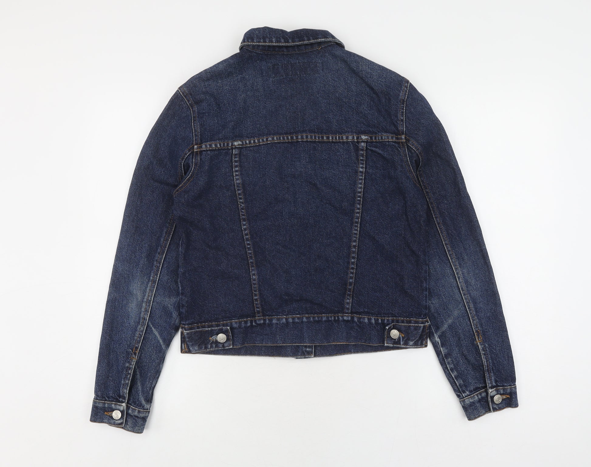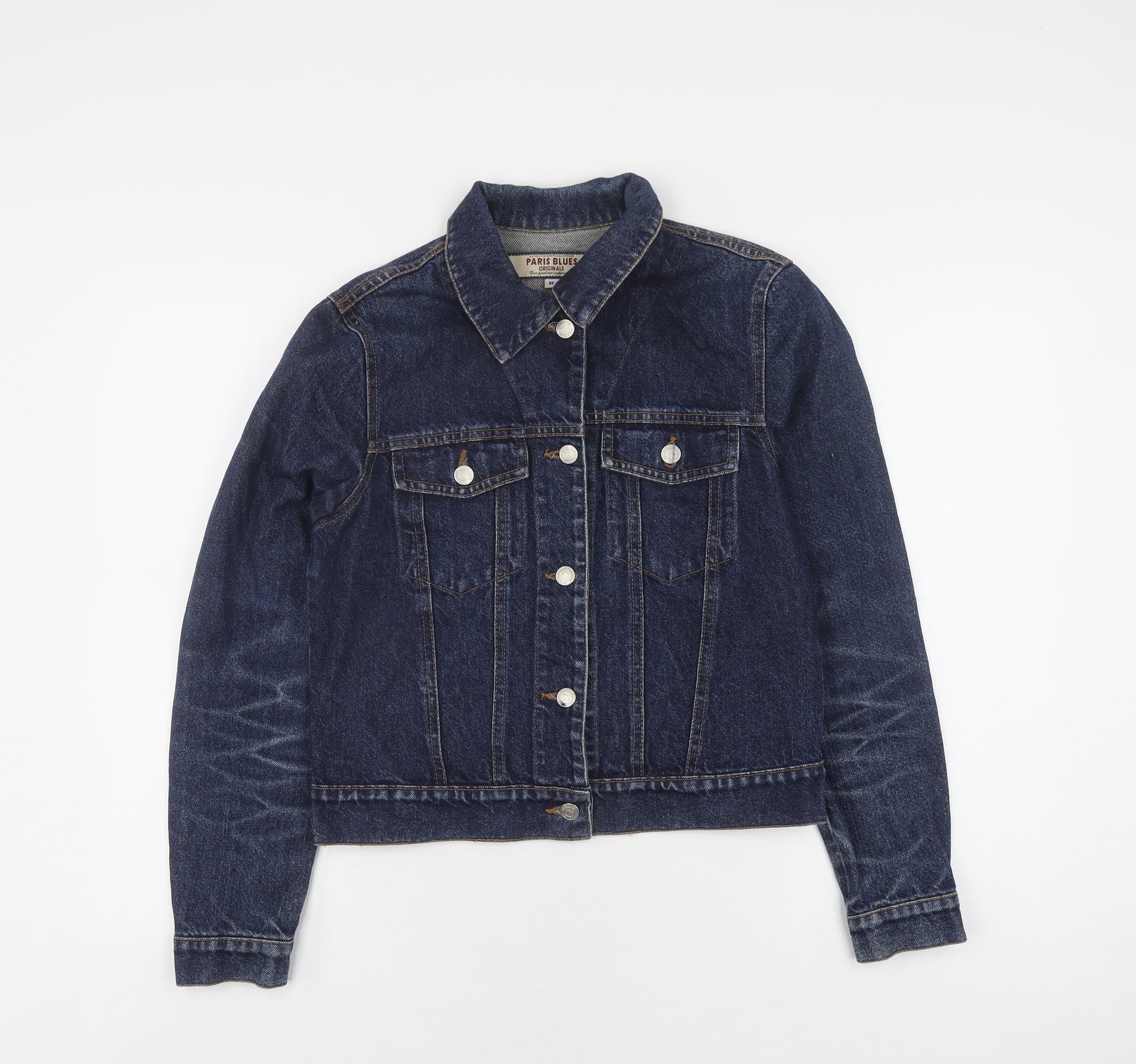 Introducing the stylish Paris Blues Women's Blue Denim Jacket, a perfect addition to your casual wardrobe. Sized M, this jacket offers a comfortable regular fit and is made from durable and soft cotton denim. It features a classic collared design with button accents, making it a timeless piece that adds a touch of sophistication to any outfit. Ideal for spring and autumn, its basic jacket style provides versatile layering options for relaxed occasions. With a short jacket length, long sleeves, and a regular fit, it ensures a flattering silhouette. The absence of patterns makes it a versatile piece suitable for various outfit combinations. Although it has some fading, it remains in excellent condition with no visible damage, promising lasting wear. Grab this piece today and enjoy its casual charm and effortless style.
