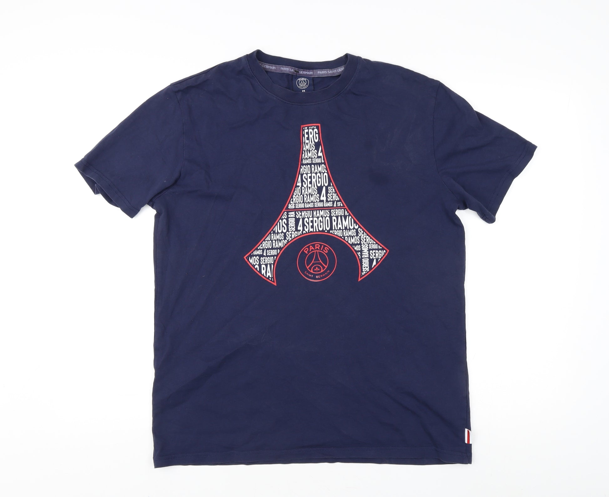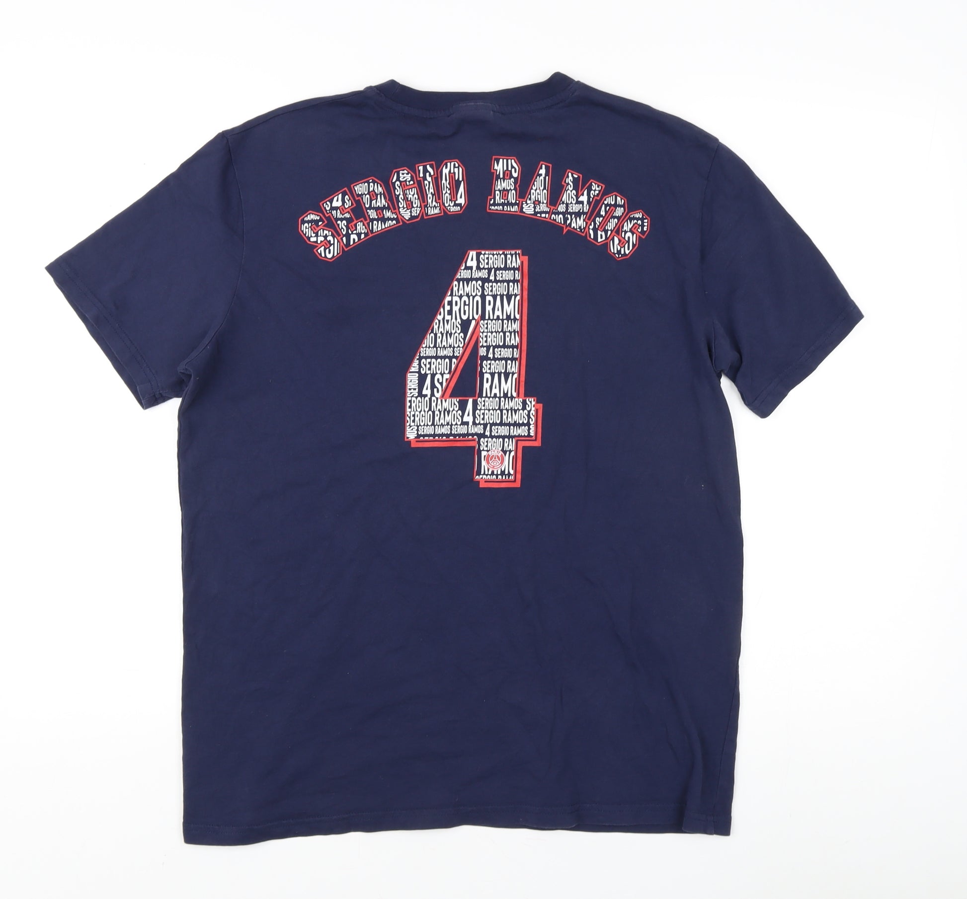 Show your support for Paris Saint-Germain with this stylish men's graphic T-shirt. Crafted from 100% cotton, this T-shirt offers comfort and breathability, making it perfect for all seasons. Designed in a striking blue colour, it features bold graphic prints on both the front and back, showcasing the iconic symbols and the name 'Sergio Ramos', perfect for any sports enthusiast. The short sleeves and crew neck design ensure a timeless and versatile look, suitable for casual outings or sports events. With a regular fit, this T-shirt caters to a medium size, providing ample comfort without compromising on style. The jersey fabric type adds a soft touch, making it an ideal choice for all-day wear. This item bears a logo accent, adding an authentic touch to your sportswear collection. Machine washable, it ensures easy maintenance, maintaining its quality and vibrancy over time. Despite slight signs of wear, the T-shirt remains in excellent condition, promising a blend of style and functionality. Whether you're an avid supporter or simply love graphic prints, this Paris Saint-Germain T-shirt is a perfect addition to your wardrobe, offering both comfort and a fashionable edge. A great gift idea for any football fan or casual fashion enthusiast.
