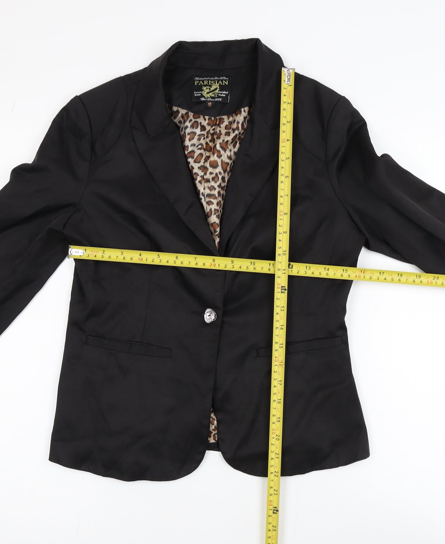 Add instant sophistication to your wardrobe with this elegant black blazer from Parisian. Designed for modern women, this stylish jacket brings a polished finish to both business and casual outfits. Expertly tailored from a blend of cotton and polyester with a touch of elastane, it offers a soft feel while providing just the right amount of stretch for comfort and fit. The blazer features a single-breasted front with a single sparkling button fastening, notch lapels and front welt pockets that enhance its classic silhouette. The interior reveals a striking leopard print satin-style lining for a trendy twist, adding personality to its timeless look. Perfect for wearing over a blouse, shirt or dress, this versatile piece transitions effortlessly from office wear to evening outfits. Pair it with tailored trousers or a pencil skirt for a confident professional look, or wear with jeans for a chic, smart-casual style. The jacket’s quality construction and flattering cut make it a wardrobe must-have. Its medium weight fabric ensures comfort through multiple seasons, ideal for spring or autumn. A versatile fashion staple that complements both formal and relaxed ensembles, this black Parisian blazer embodies effortless style with a fashionable edge. The condition is excellent with minimal signs of wear, ensuring that you can enjoy a high-quality garment ready to elevate your outfit the moment you put it on.