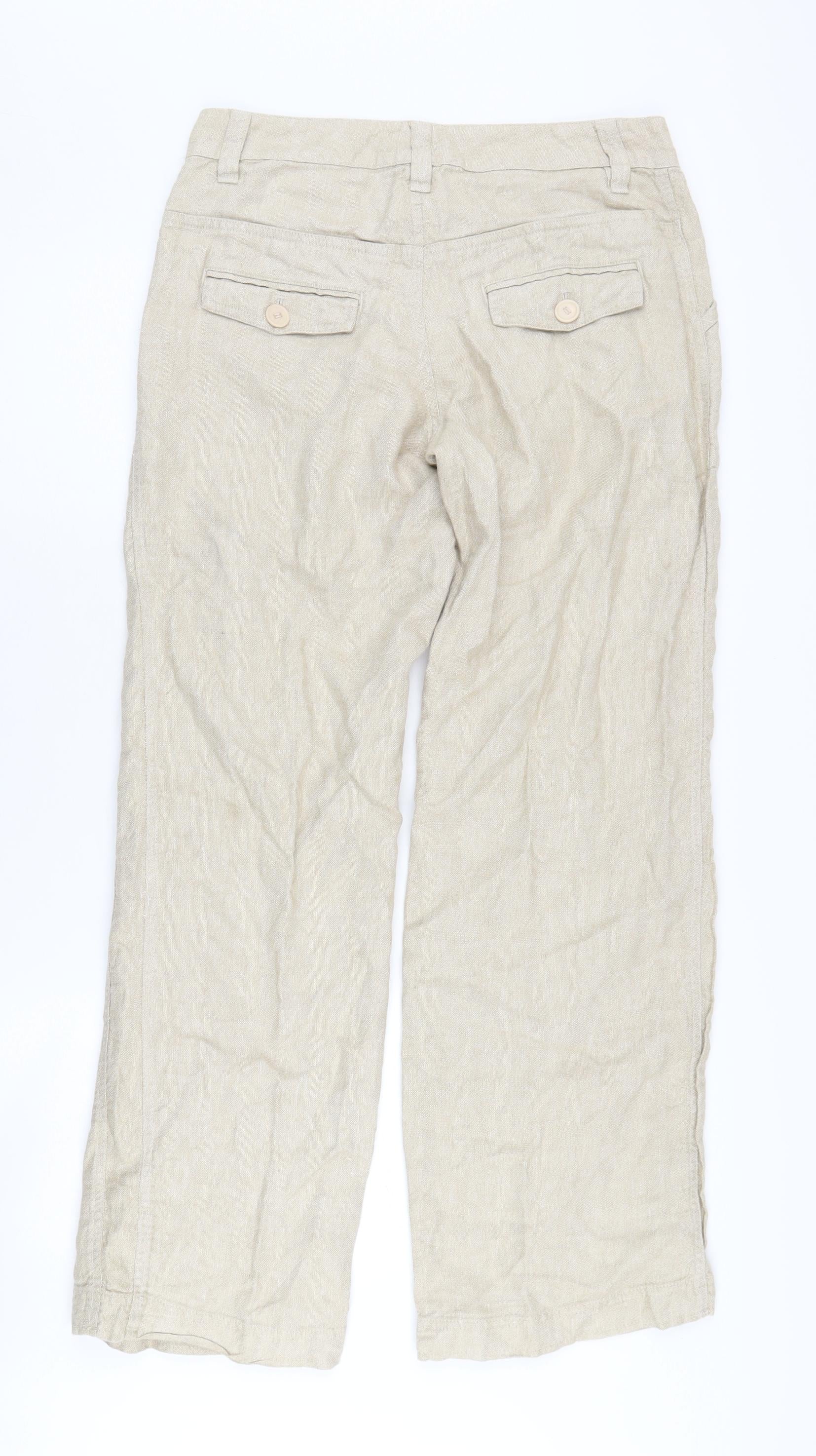 Discover elegance and comfort with these Part Two Women's Beige Linen Trousers. Perfect for casual and smart-casual occasions, these trousers promise both style and flexibility, making them an ideal addition to your wardrobe. Crafted primarily from linen with a touch of cotton, they offer breathability and a luxurious feel against the skin. The straight leg style adds a classic touch, making these trousers versatile enough to pair with various tops and footwear. Featuring a button closure for a secure and comfortable fit, these trousers are designed for ease of wear. The neutral beige colour ensures they easily complement any ensemble, providing a clean and polished look for different settings. Although slightly worn, they remain in very good condition, with only a minor stain at the front, barely noticeable and easily overlooked by their stylish appeal. Ideal for those who appreciate a minimalist aesthetic, these flat front trousers are perfect for keeping your wardrobe effortlessly chic. These trousers, ensuring easy maintenance with machine-washable fabric, are a practical yet fashionable choice for modern women. Obtain the timeless appeal and comfort of these Part Two linen trousers, a wardrobe essential that effortlessly adapts to every season.