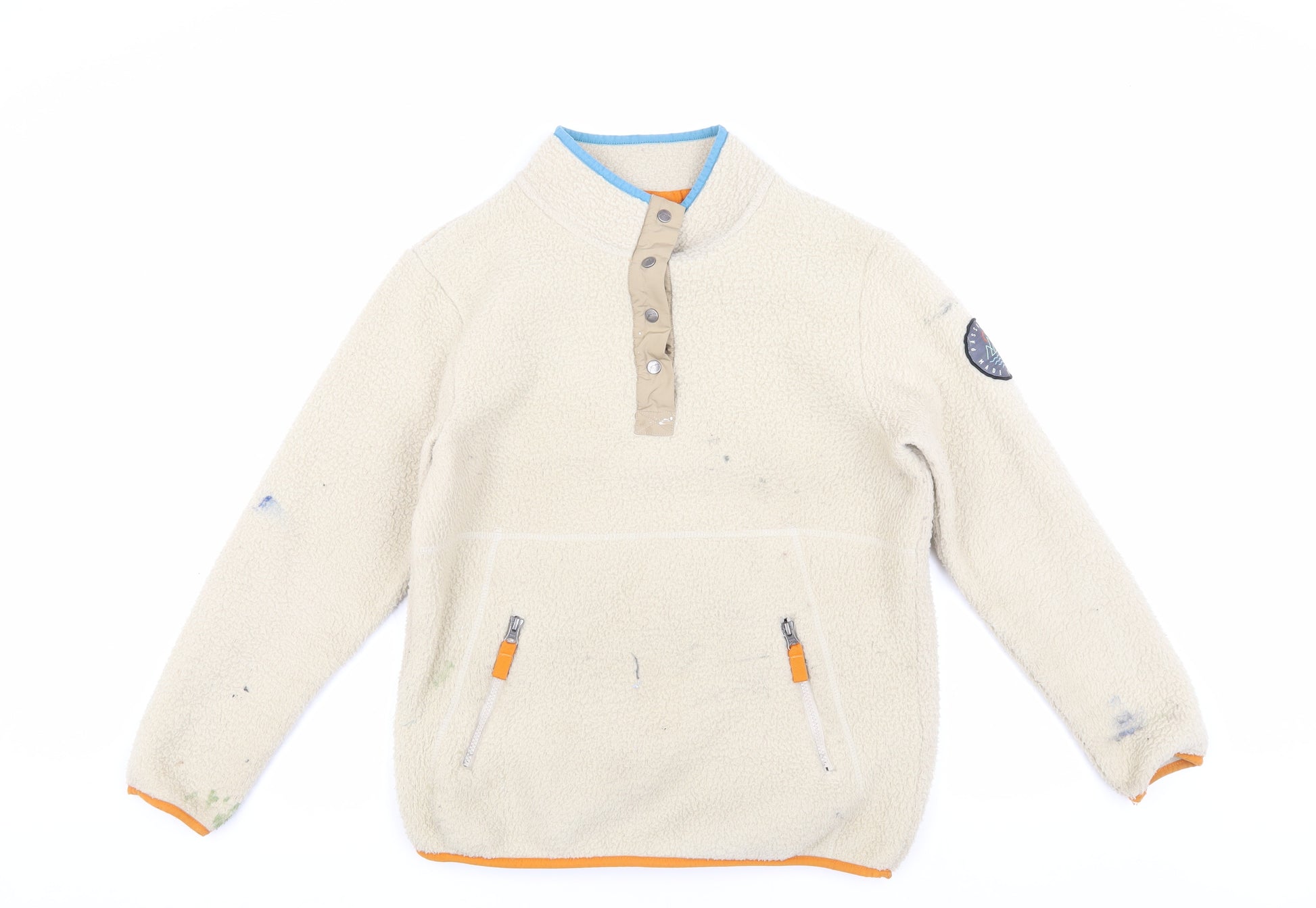 Explore the great outdoors in style with this Passenger men's fleece sweatshirt in a versatile beige hue. Sized medium, this henley-style top offers a comfortable regular fit, perfect for layering in autumn and winter months. Crafted from 100% polyester, its fleece fabric provides exceptional warmth and softness. The high neckline and long sleeves ensure you stay protected from the chill, while snap closures add a practical touch for easy wear. Despite a few visible marks, this sweatshirt remains in good condition, making it a reliable choice for casual outings or relaxed weekends. The added benefit of roomy front pockets allows for convenient storage of essentials, making it as functional as it is stylish. Easy to care for, this machine-washable garment effortlessly integrates into your everyday wardrobe. Don't miss out on this practical piece that is perfect for any cool-weather adventure. Whether you're hiking the trails or enjoying a laid-back day in town, this Passenger fleece sweatshirt is designed to keep you cosy and comfortable.