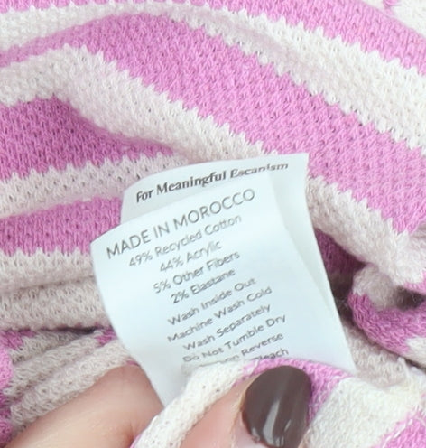 Add a splash of adventurous style to your wardrobe with this Passenger women's long sleeve T-shirt in pastel pink and white stripes. Designed with comfort and laid-back style in mind, this top captures the spirit of casual travel and everyday ease. Crafted from a soft, breathable cotton blend containing recycled fibres, it features 49% cotton, 44% acrylic, 5% other fibres, and a touch of elastane for added stretch and shape retention. The lightweight knit fabric makes it ideal for layering or wearing on its own throughout the year.The relaxed fit and classic boat neckline offer an effortless draped silhouette, while the charming horizontal stripes bring a cheerful, beach-inspired aesthetic. Perfect for weekends, daily errands, holidays, or casual office wear, this top embodies easy-going feminine versatility. The long sleeves add warmth for transitional weather, making it ideal from spring through to autumn.Machine washable for hassle-free care, this top is as practical as it is stylish. Passenger’s thoughtful design ethos combines comfort, quality, and sustainability, ensuring this is a piece you’ll reach for again and again. In excellent pre-owned condition, it shows minimal signs of gentle wear with no visible flaws, maintaining a crisp appearance and soft texture.Pair this striped top with jeans or linen trousers for a laid-back, coastal-inspired look, or tuck it into a skirt for a chic, everyday outfit. Whether you’re planning a relaxed day out or cosy evening indoors, this T-shirt offers the perfect balance between easy wear and timeless charm. Embrace effortless comfort and coastal flair with this relaxed Passenger long sleeve striped top – your ideal companion for every casual adventure.