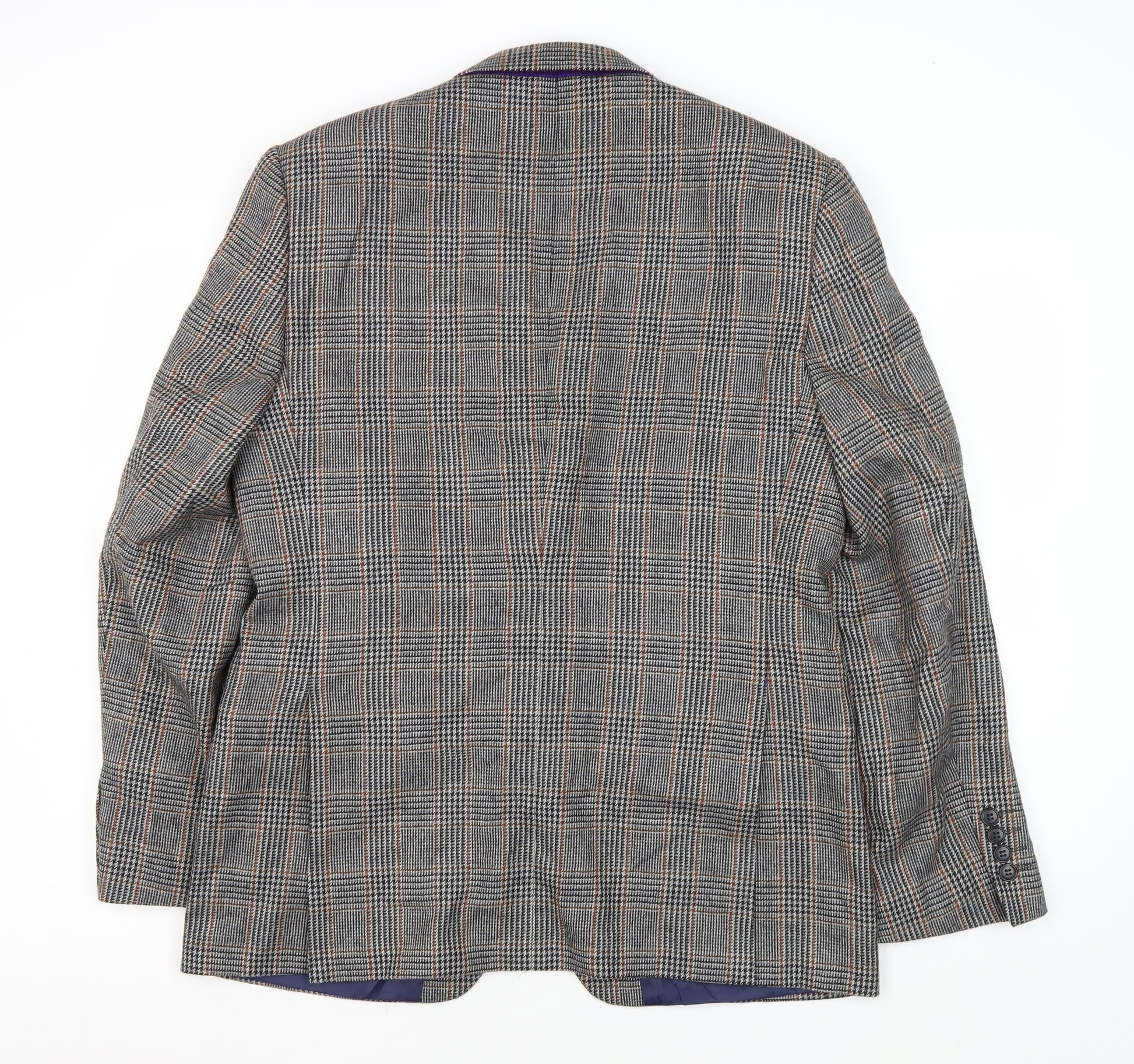 Elevate your wardrobe with this sophisticated Paul Costelloe men's blazer. Crafted from 100% wool, this jacket offers warmth and style, perfect for the autumn and winter seasons. The subtle grey plaid pattern and single-breasted design with a two-button front exude classic elegance. Ideal for business or formal occasions, this blazer features a regular fit and notch lapel style, allowing you to make a refined impression in any setting. The jacket is lined with a smooth blend of polyester and viscose, ensuring comfort throughout the day. Designed with a single vent for ease of movement and four-button sleeve cuffs, this blazer combines practicality with style. Though pre-owned, it is in excellent condition, showing no visible wear or damage, making it a lasting addition to your collection. With its timeless appeal, this blazer is perfect for the discerning gentleman seeking to enhance his ensemble with a touch of elegance. Transform your look with this must-have Paul Costelloe blazer, designed to offer a polished appearance and ultimate comfort.