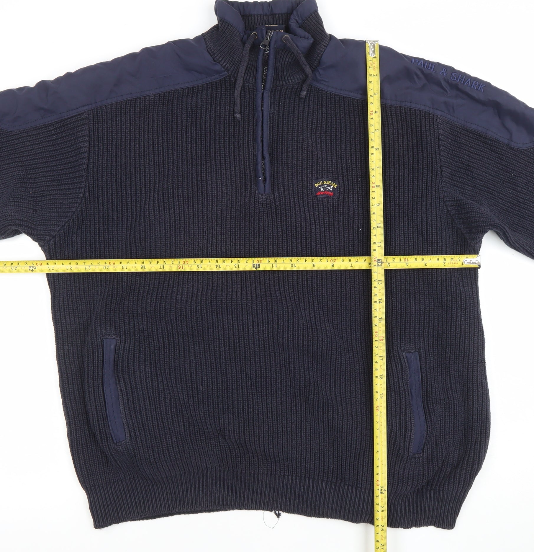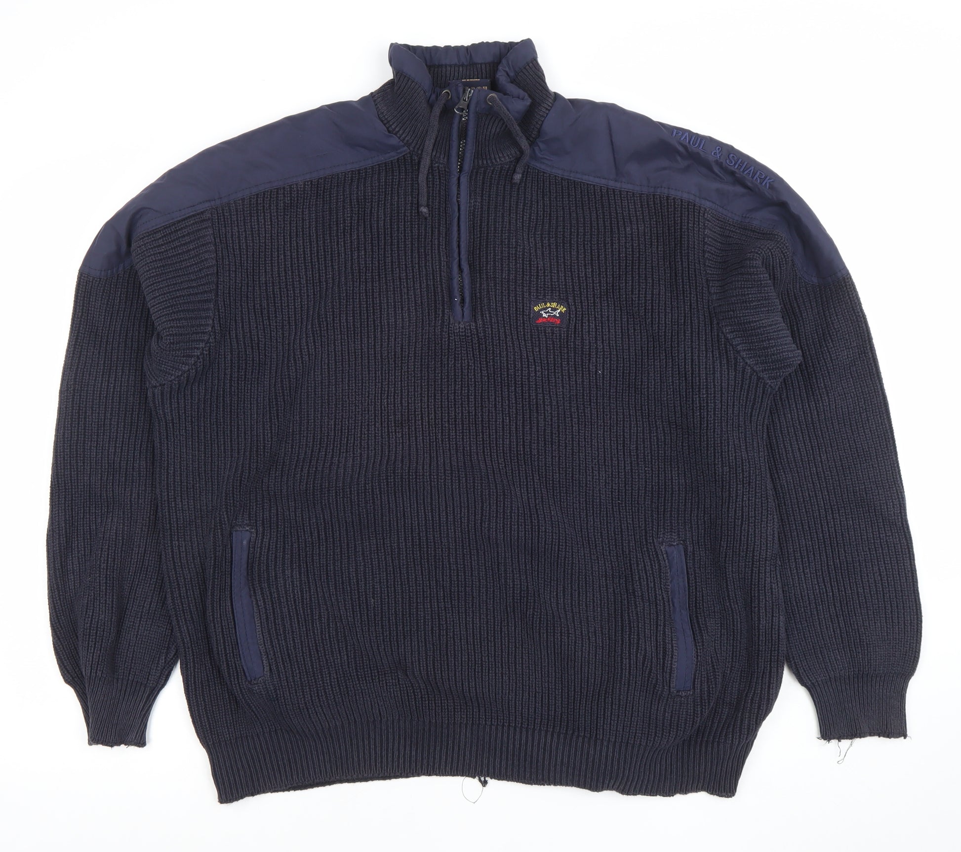 Experience premium comfort and timeless nautical style with this Paul & Shark men's pullover sweatshirt in classic navy blue. Crafted from 100% pure cotton, this heavyweight knit offers excellent warmth and breathability, perfect for cooler months or transitional weather. The soft, ribbed fabric provides lasting comfort while maintaining its shape, making it ideal for casual outings or outdoor adventures.This finely made sweatshirt features a high neck with a quarter-zip fastening and drawstring for adjustable comfort. The shoulder panels and zip accents add a modern touch, while the embroidered Paul & Shark logo proudly displayed on the chest showcases its luxury heritage. Functional side pockets offer convenience and warmth for your hands, enhancing the garment’s everyday practicality.The ribbed cuffs and hem provide a snug fit, ensuring the pullover retains its structure through wear. Its deep navy tone makes it versatile and easy to pair with jeans, chinos, or cargo trousers for a sophisticated relaxed look. Designed with an emphasis on durability and function, this piece is perfect for men who appreciate both style and substance — equally at home during a weekend walk, casual gathering, or coastal break.In very good condition with only minor wear noted to the cuffs and hem, this sweatshirt remains a standout example of Paul & Shark’s craftsmanship. Ideal for autumn, winter, and spring wear, it delivers exceptional quality and refined casual appeal. Don’t miss the chance to add this luxurious, Italian-made knit to your wardrobe at great value. Whether you’re going out for a brisk walk or relaxing indoors, this sweatshirt embodies versatile comfort and timeless maritime charm.
