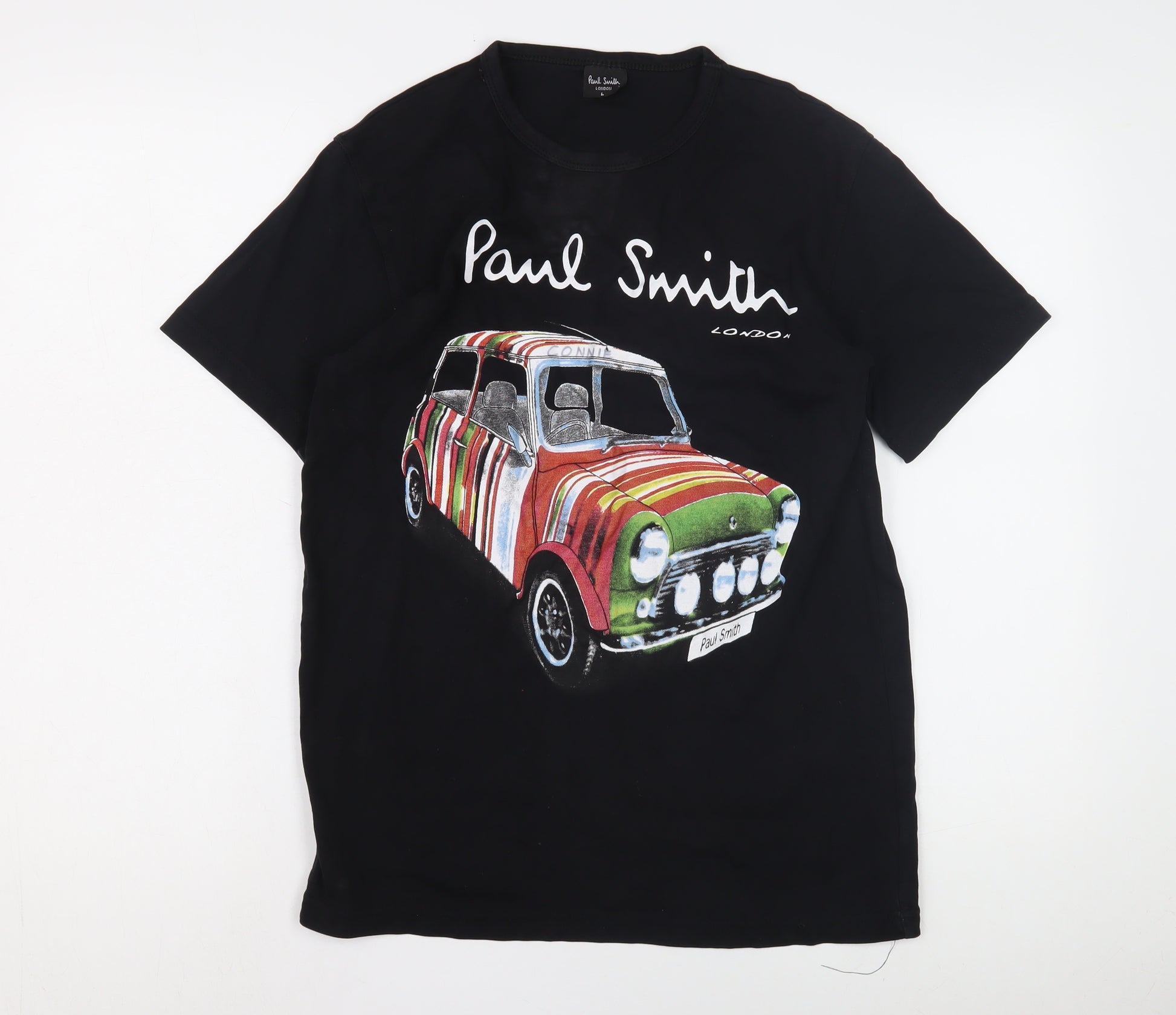 Elevate your casual wardrobe with this stylish Paul Smith men's T-shirt, featuring an eye-catching graphic car design that's sure to turn heads. Presented in classic black, this T-shirt is crafted from 100% cotton, ensuring a comfortable fit and lightweight feel, perfect for day-long wear. The crew neck and short sleeves add to its laid-back style, making it an ideal choice for a variety of occasions, whether you're heading to a casual outing or relaxing at home.Showcasing the distinct Paul Smith design flair, this T-shirt boasts a vibrant graphic print that captures the playful spirit of the brand. The shirt belongs to the 'Cars' theme, a delightful nod to automotive enthusiasts or anyone looking for a unique addition to their T-shirt collection. Available in a large size to fit a regular body type, this piece effortlessly combines fashion with comfort.Although it does not come with original retail tags, this T-shirt is in excellent condition, showing no visible signs of wear, making it a reliable and stylish pick for the discerning shopper. Whether paired with jeans, shorts, or layered under a jacket, its versatility ensures it will become a staple in your collection.Grab this must-have Paul Smith T-shirt today, promising both quality and distinct style. A perfect gift for yourself or a loved one, ideal for expressing your individuality through unique fashion.
