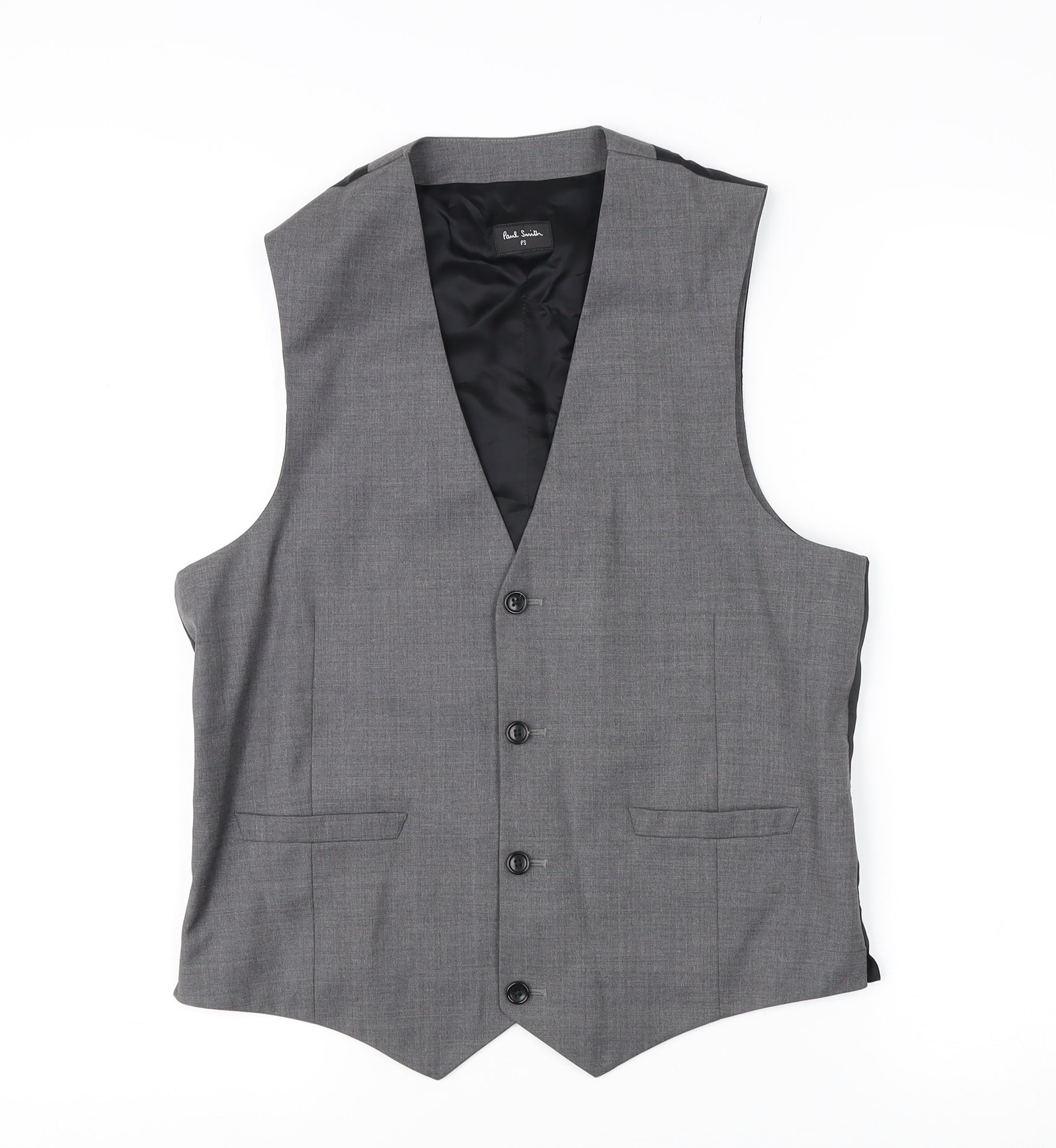 Elevate your wardrobe with this sophisticated grey waistcoat by Paul Smith, meticulously crafted for men with a keen sense of style. Made in Portugal, this gents waistcoat features premium 100% wool for the outer shell, providing a luxurious and warm feel suitable for casual and formal occasions. The lining is composed of 100% Viscose, ensuring comfort and breathability throughout the day. With a regular fit and no pattern, this waistcoat boasts timeless elegance and versatility. The button closure design adds a classic touch, making it perfect for layering over a shirt or under a blazer. Ideal for occasions that call for a hint of refinement, from smart business casual meetings to formal events. Although previously owned, this piece remains in excellent condition with no visible wear or damage, ready to enhance your ensemble. Secure this stylish garment today and enjoy a blend of comfort and class synonymous with the Paul Smith brand.
