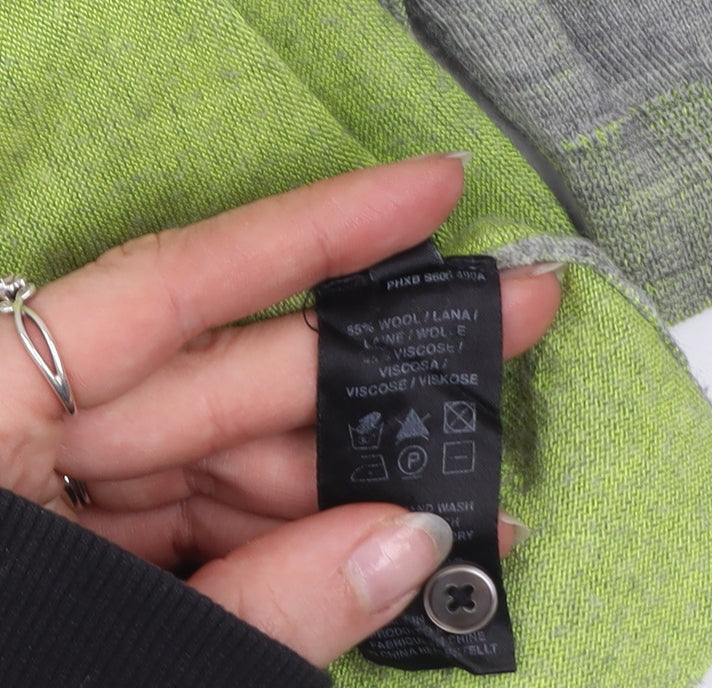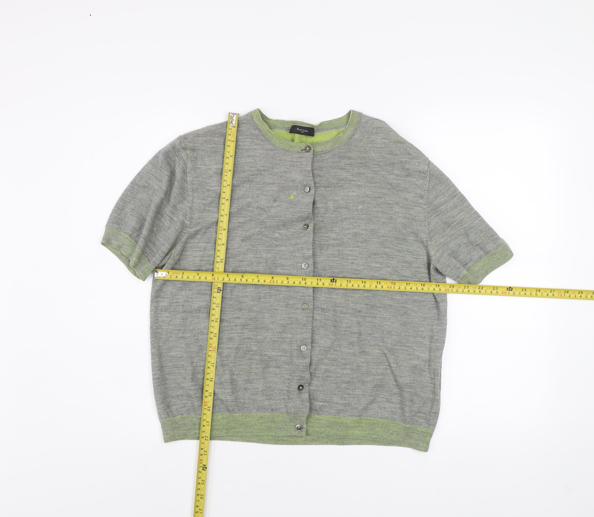 Elevate your casual wardrobe with this beautifully crafted Paul Smith Women’s cardigan in a refined grey tone, accented subtly with soft green trims along the neckline, cuffs, and hem. Part of the Paul Smith Black label collection, this cardigan embodies the brand’s signature modern British style with a minimalist yet polished appeal. Made from a luxurious blend of 55% wool and 45% viscose, the piece provides natural breathability and lightweight comfort, making it ideal for transitional weather through spring, summer, and autumn.Designed with a classic crew neckline and short sleeves, it offers an effortlessly wearable silhouette that flatters while maintaining a timeless shape. The front button closure introduces a touch of elegance, allowing for versatile styling whether layered over a blouse or worn casually on its own. The fine knit construction ensures both quality and comfort, while the tailored regular fit delivers a balanced, relaxed drape suitable for everyday wear.Although in very good pre-owned condition with minor fabric pilling near the seams, this piece retains its structural integrity and softness, a testament to Paul Smith’s premium craftsmanship. Perfect for weekend outings, smart-casual workdays, or travel, this cardigan can be effortlessly paired with tailored trousers, skirts, or denim for a sophisticated yet laid-back finish.With its understated design and luxury material blend, this Paul Smith cardigan is a versatile staple that will bring both comfort and sophistication to your wardrobe. Hand wash only to maintain its delicate texture and ensure lasting wear. Don’t miss the chance to add this sought-after piece from one of Britain’s most respected designers to your collection today.