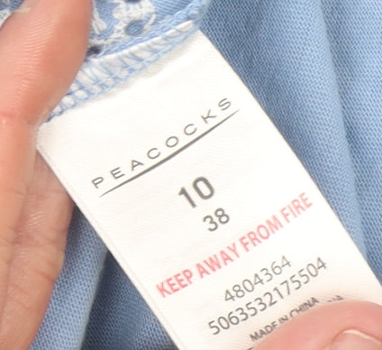 This charming Peacocks women’s blue embroidered T-shirt combines casual comfort with a delightful touch of style. Made from a soft and breathable blend of 66% polyester and 34% cotton, this versatile short-sleeve top offers lightweight wear perfect for spring and summer. The intricate white geometric embroidery design across the front adds a subtle texture and decorative appeal, giving it a distinctive yet understated look ideal for day-to-day wear. Designed with a crew neckline and a regular fit, this top delivers both comfort and ease of movement, making it a reliable favourite for any casual occasion. The classic short sleeves and pullover closure enhance its laid-back style, while the high-quality jersey fabric ensures durability and shape retention wash after wash. Ideal for pairing with jeans, shorts, or skirts, this piece transitions effortlessly from relaxed mornings to casual afternoons. Its breathable composition keeps you cool and comfortable, while the finish gives a touch of uniqueness without compromising on practicality. Despite some light creasing from storage, the top remains in excellent condition with no visible signs of significant wear or damage. It’s a superb addition to any wardrobe for those seeking an affordable combination of quality and style from a trusted British brand. Whether worn as a standalone piece or layered for a trendy streetwear-inspired look, this top embodies easy-going femininity and versatility. A great everyday essential for warmer seasons, it brings together comfort, simplicity, and style in one effortlessly wearable design.