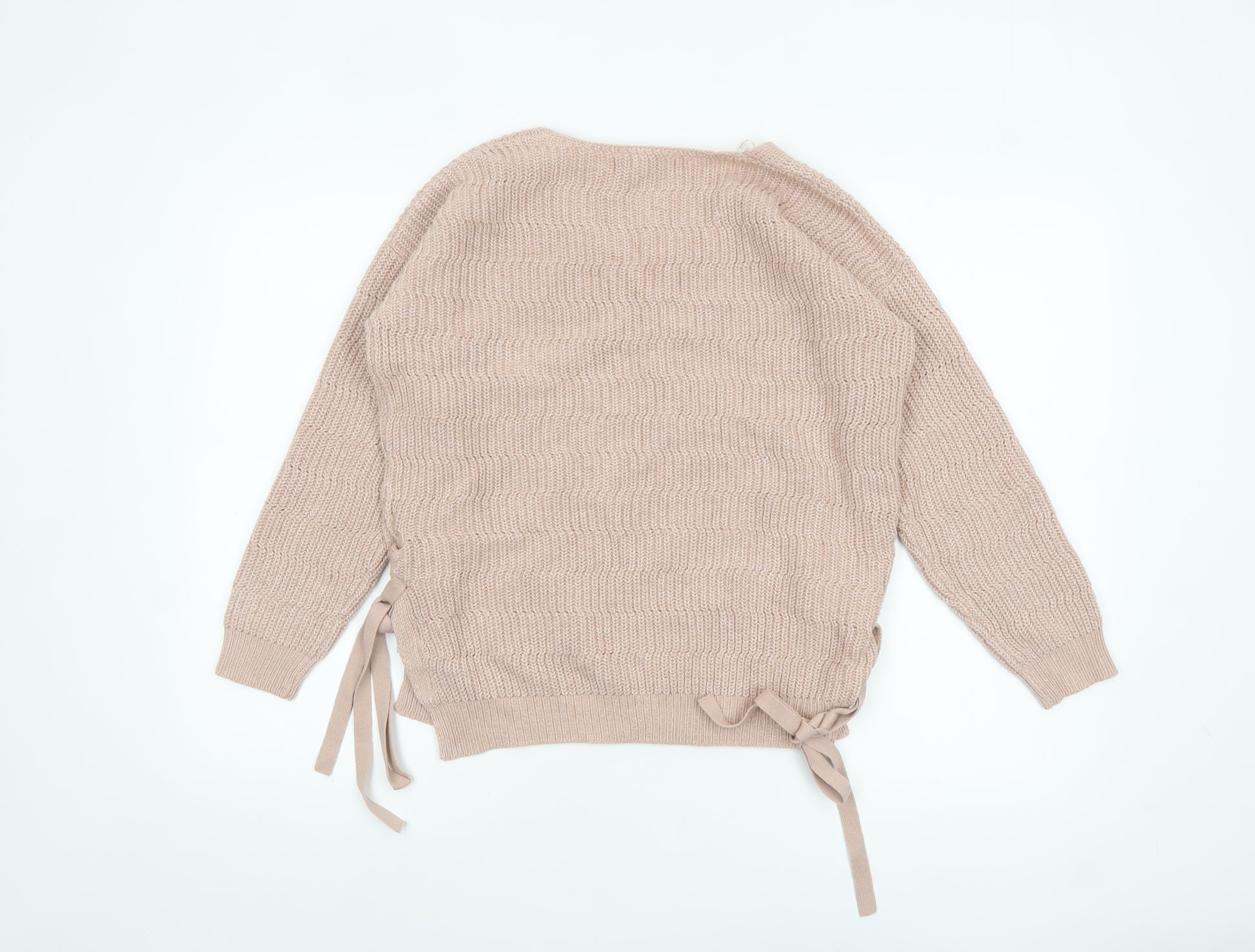 This lovely Peacocks women's jumper offers easy style and comfort in a neutral beige shade that's perfect for any season. Crafted from a quality blend of 82% acrylic and 18% cotton, it offers a soft, breathable feel while remaining durable and easy to care for. Designed with a flattering V-neckline and long sleeves, this pullover jumper provides a timeless look suitable for layering or wearing on its own. The chunky-knit texture adds depth and warmth, while the decorative bow ties on each side bring a feminine and playful touch to the overall design. Its relaxed, regular fit ensures comfort, making it ideal for pairing with jeans or trousers for a laid-back yet stylish appearance. Perfect for everyday wear, autumn strolls, or cosy evenings, this jumper adds understated charm to any outfit. Machine washable for convenience, it’s a versatile wardrobe staple you can rely on for multiple occasions. The jumper is in excellent pre-loved condition, showing minimal signs of wear and no visible defects. A must-have piece for women seeking comfort, versatility, and effortless chic style from a trusted high-street brand. Ideal for casual occasions, this piece will be a go-to for seasons to come. Enjoy warm comfort and soft elegance with this Peacocks beige knit pullover — a wardrobe essential that pairs beautifully with your favourite denim or skirts for year-round wear.