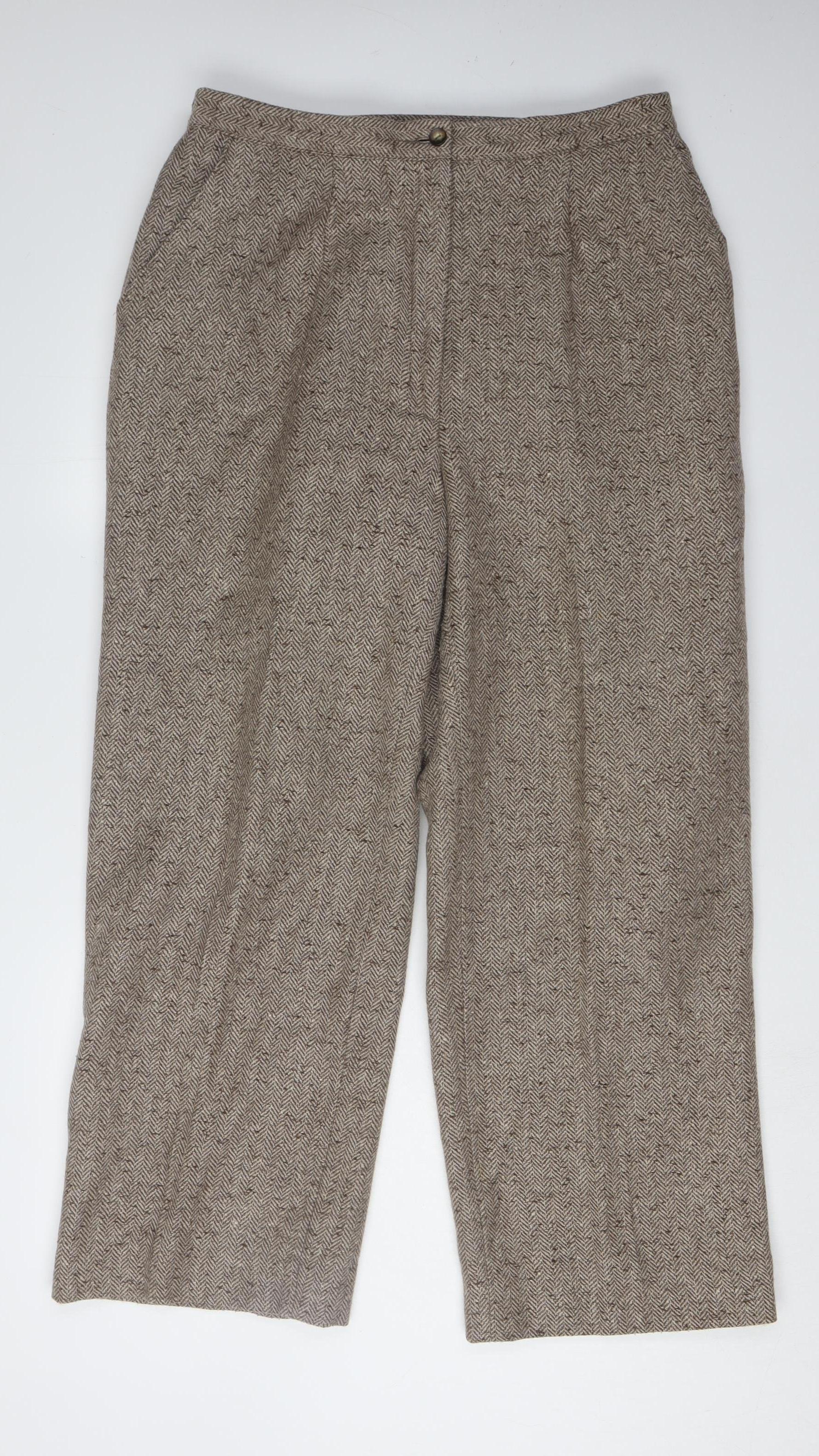 Step into sophistication with these classic Penny Plain Women's Brown Wool Trousers. Crafted predominantly from soft, insulating wool, these trousers are perfect for bringing warmth to your winter wardrobe. The subtle herringbone pattern adds a touch of visual interest, making them an elegant choice for both professional and casual settings. Designed in a size 18, these straight-leg trousers provide a comfortable and timeless fit that flatters a range of body shapes. With a mid-rise design, they offer a balanced silhouette, whether paired with a smart blouse or a cosy knitwear piece. These trousers feature a flat front and button closure, promising a sleek finish to your look. The material composition of 75% wool, 20% polyamide, and 5% other fibres ensures both warmth and durability, making them suitable for day-long wear during cooler months. The exquisite construction speaks to Penny Plain's reputation for quality. Enjoy the casual elegance that transitions effortlessly from a business meeting to a relaxed evening out, making these trousers a versatile addition to any wardrobe. Enhanced for autumn and winter wear, these trousers are as practical as they are stylish. The excellent condition, marked by the absence of visible wear and tear, ensures an enduring piece that will hold its charm and functionality over time. Indulge in the classic charm of these tailored trousers for a thoroughly chic appearance this season.