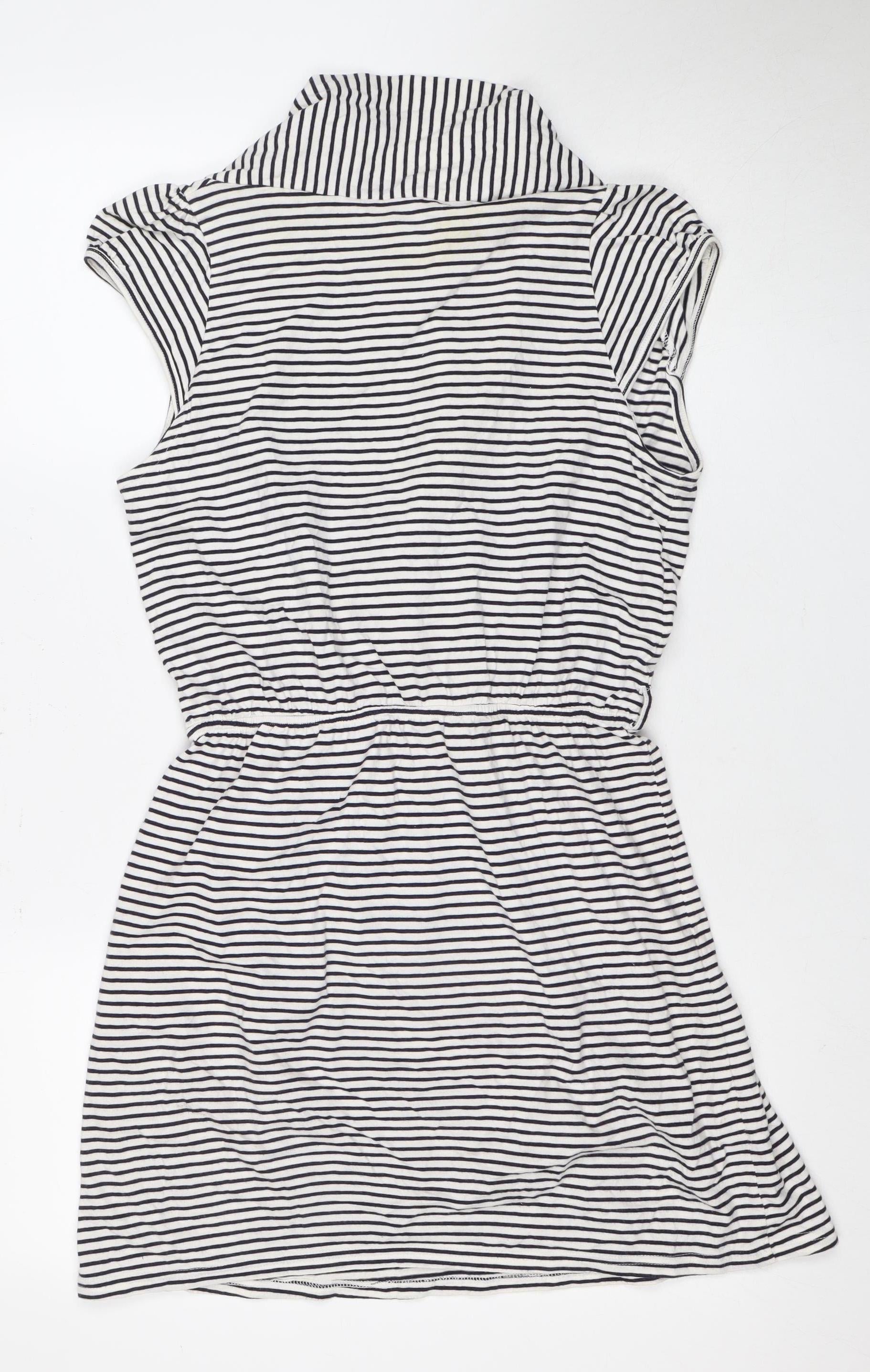 Elevate your casual wardrobe with this charming People Tree dress. Crafted from 100% organic cotton, this dress ensures comfort and style, perfect for everyday wear. Its timeless black and white stripes add a classic touch, making it a versatile piece in your closet. Designed in a flattering shift silhouette, it offers a relaxed fit that's both fashionable and effortless. Whilst this dress features a round neckline and is adorned in soft jersey fabric, making it ideal for warm-weather occasions or layering with jackets in cooler seasons. The absence of attached retail tags suggests it’s previously owned but maintained in excellent condition, with the fabric slightly wrinkled but ready to smooth out with wear. Pair with sandals for a laid-back summer look or boots for a more polished ensemble. Whether you're heading to a casual brunch or a relaxed day out, this People Tree dress will keep you looking chic and sustainably fashionable.