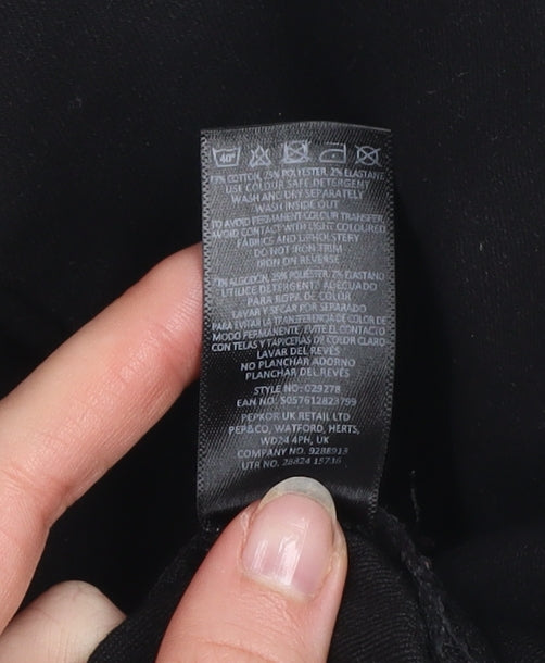 These Pep & Co Women’s Black Skinny Jeans in size 12 offer the perfect blend of comfort and flattering fit for everyday wear. Crafted from a quality blend of 69% cotton, 29% polyester and 2% elastane, they provide a soft yet durable denim feel with just the right amount of stretch for easy movement. The mid-rise waist and slim fit design contour the body while maintaining a comfortable silhouette, making these jeans suitable for both casual and smart-casual outfits. Designed in a classic solid black colour, these jeans are incredibly versatile and can be paired effortlessly with virtually any top, from cosy jumpers to sleek blouses. The elasticated waistband ensures comfort without the need for a button or zip closure, while traditional elements such as belt loops and pockets add practicality. The stretch fabric enhances shape recovery, offering a flattering look that stays comfortable all day. Perfect for wearing throughout the autumn, winter, and spring seasons, these jeans are also easy to care for – simply machine wash and wear. Their dark wash finish adds a touch of sophistication, making them suitable for both work and leisure. Whether you dress them up with heels and a blazer or keep it casual with trainers and a T-shirt, these Pep & Co jeans will become a reliable staple in your wardrobe. In excellent pre-loved condition, they show only minimal wear and no visible defects, ensuring great value and long-lasting wear. These jeans strike the ideal balance between everyday comfort and classic style, giving you an easy go-to pair for your wardrobe rotation. A fantastic choice for those seeking affordable, comfortable, and effortlessly stylish denim.