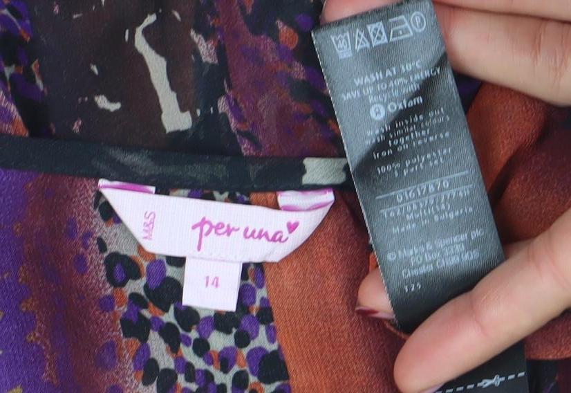 Step into vibrant sophistication with this Per Una women’s multicoloured tunic blouse, the perfect combination of colour and comfort. Designed in a lightweight, airy chiffon fabric made from 100% polyester, this blouse offers an effortlessly elegant drape that flatters the figure while keeping you cool in warmer months. The striking multicoloured design features abstract stripes intertwined with a subtle animal print in rich shades of orange, purple, red, black, and ivory. This bold yet tasteful colour mix makes it ideal for dressing up smart-casual looks or adding flair to your evening attire. The blouse features a relaxed, flowy shape with a gathered waist detail that enhances the silhouette without clinging, while the flutter sleeves add a touch of femininity and movement. The scoop neckline is soft and flattering, making it suitable for layering with simple jewellery or under a smart blazer. Its sheer quality exudes lightness and sophistication – perfect for summer days, spring evenings, or paired with sleek trousers and heels for parties and social occasions.Machine washable for easy care, this versatile top by Per Una ensures both style and practicality. The quality polyester fabric makes it durable and ideal for travel, offering wrinkle resistance and easy packing. This blouse is marked as size 14 in a regular fit, suitable for women seeking an easy-wear yet elegant wardrobe piece. With its flowing design and colourful pattern, this Per Una blouse captures the essence of chic, modern femininity. It’s perfectly suited for casual lunches, garden parties, and even smart office looks when paired with tailored separates. In excellent pre-owned condition with no visible flaws, it’s a beautiful find for those seeking a high-quality blouse at a great price. Add this versatile, eye-catching top to your collection and let its effortless elegance and comfortable fit enhance your seasonal wardrobe.