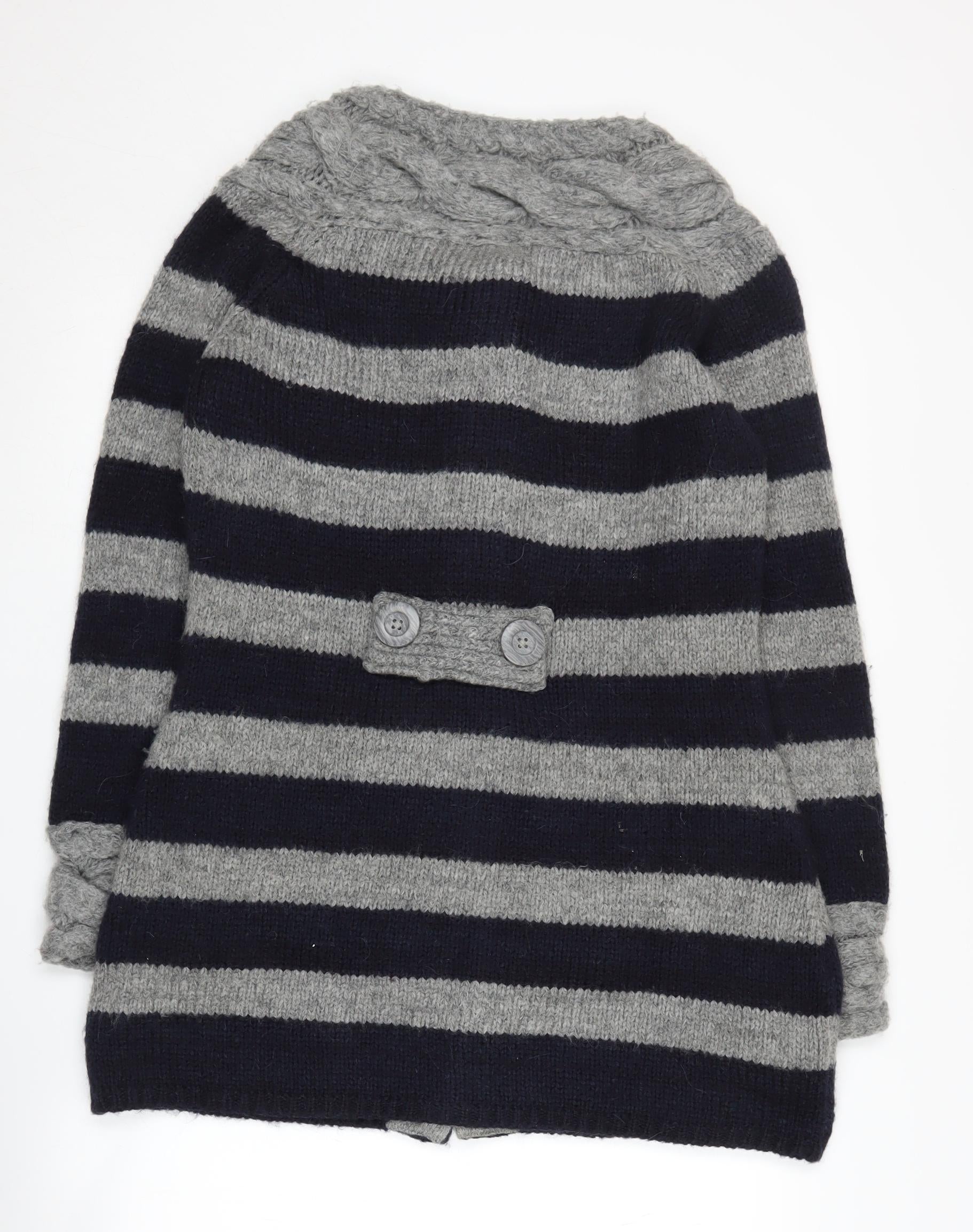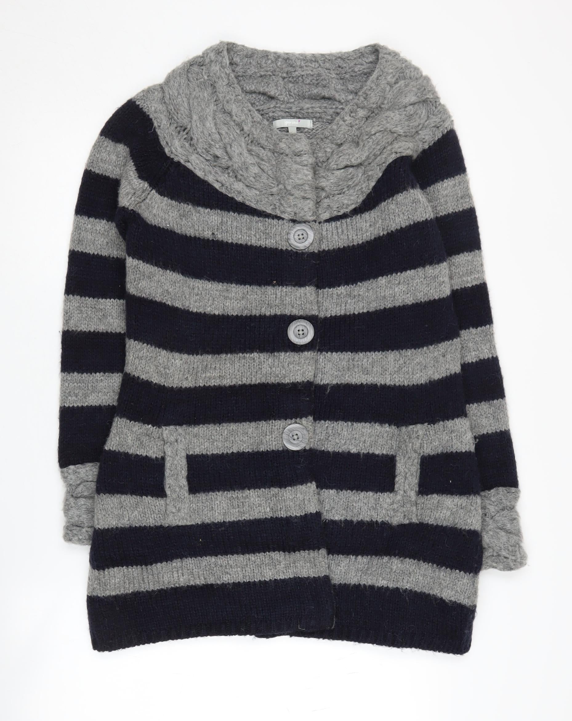 Stay cosy and stylish with this Per Una Women's Black Striped Cardigan, perfect for the chilly autumn and winter months. Crafted in a comfortable, chunky-knit style, this cardigan offers a relaxed fit in a medium size, making it ideal for layering over your favourite outfits. The cardigan features a chic cowl neck and long raglan sleeves, offering a touch of elegance and extra warmth. A bold striped pattern in black and grey adds a modern twist to this classic piece. Made from a blend of materials, including acrylic, polyester, polyamide, and wool, it ensures both durability and softness. The piece is accented with buttons for a classic look and is machine washable for easy care. Ideal for casual occasions, this cardigan pairs beautifully with jeans and boots for a laid-back ensemble or can be dressed up with smart trousers for a more polished vibe. Whether you're heading out for a relaxed weekend brunch or enjoying a cozy night in, this Per Una cardigan will keep you looking stylish and feeling comfortable.